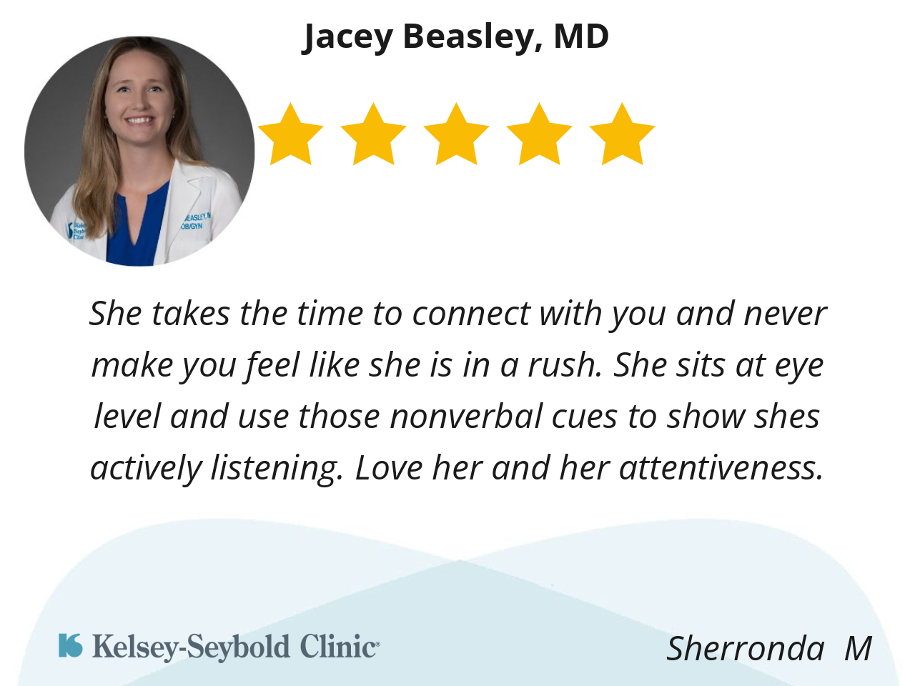 Dr. Beasley is the kindest doctor I’ve ever had. I found her through a friend that goes to Kelsey for her appointments. I was excited to hear she also does OB so I can keep her as a doctor once I move into plans of becoming a mother one day.