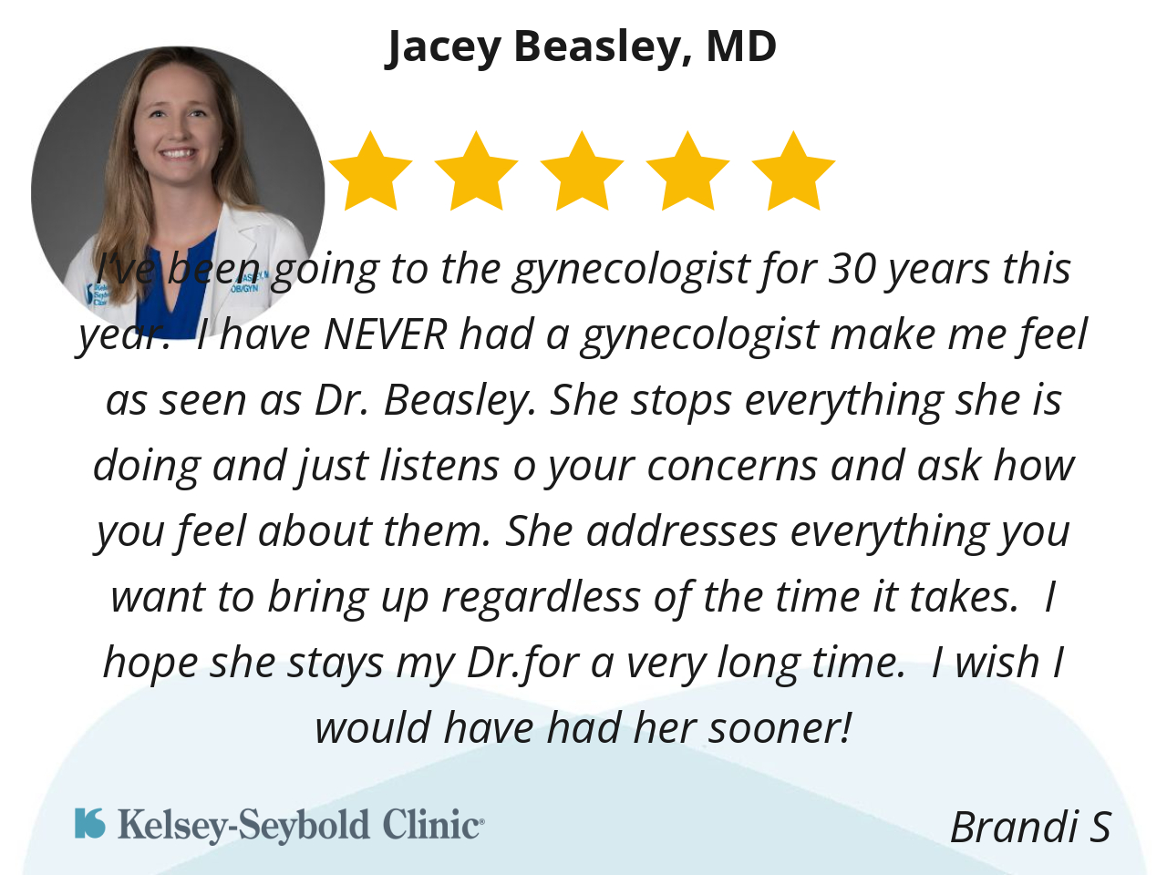 I’ve been going to the gynecologist for 30 years this year. I have NEVER had a gynecologist make me feel as seen as Dr. Beasley. She stops everything she is doing and just listens o your concerns and ask how you feel about them. She addresses everything you want to bring up regardless of the time it takes. I hope she stays my Dr.for a very long time. I wish I would have had her sooner!