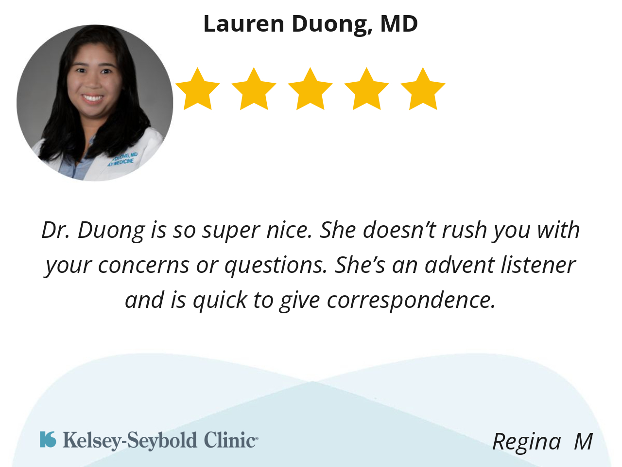 Dr. Duong is so super nice. She doesn’t rush you with your concerns or questions. She’s an advent listener and is quick to give correspondence.