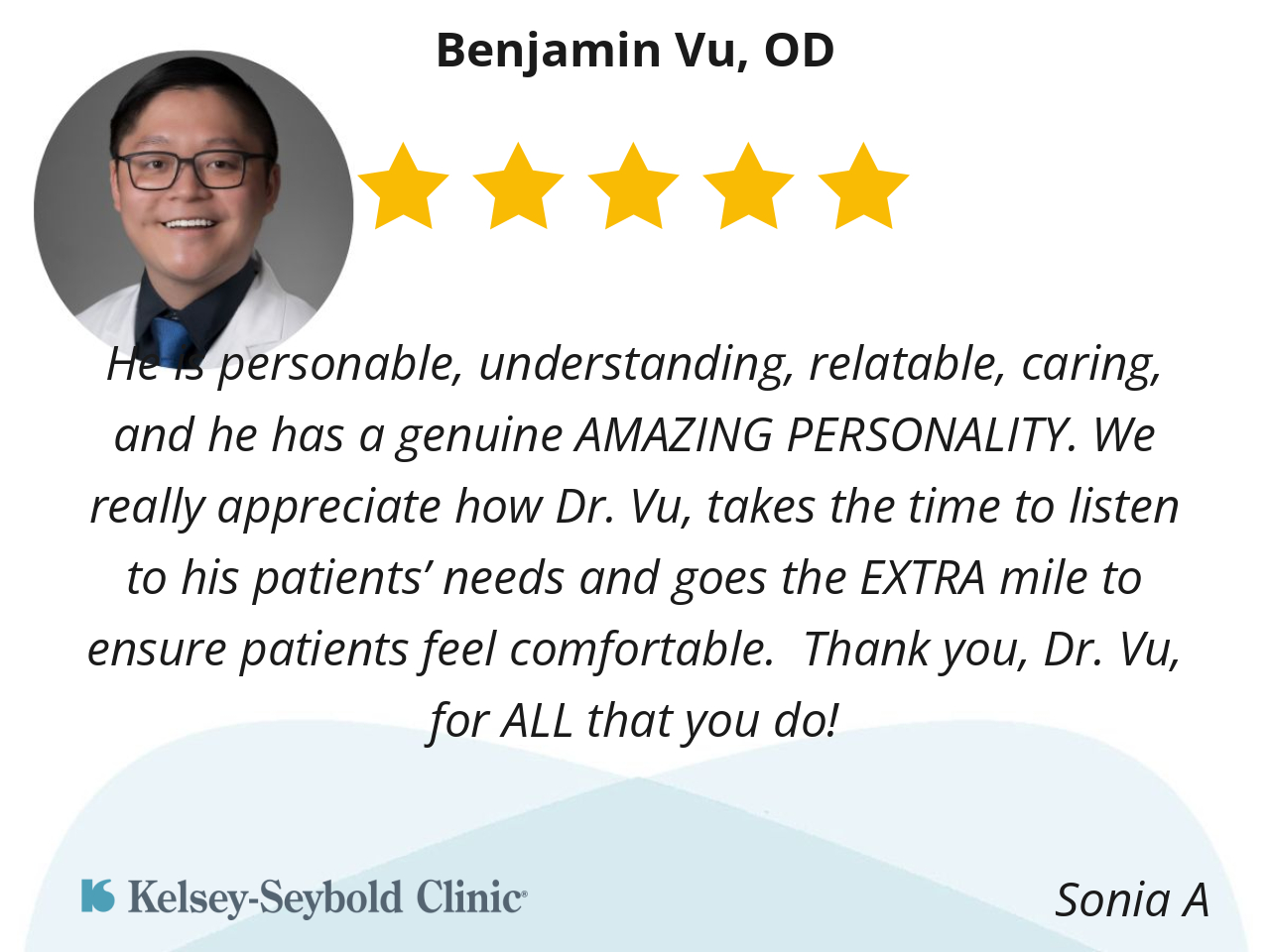 He is personable, understanding, relatable, caring, and he has a genuine AMAZING PERSONALITY. We really appreciate how Dr. Vu, takes the time to listen to his patients’ needs and goes the EXTRA mile to ensure patients feel comfortable. Thank you, Dr. Vu, for ALL that you do!