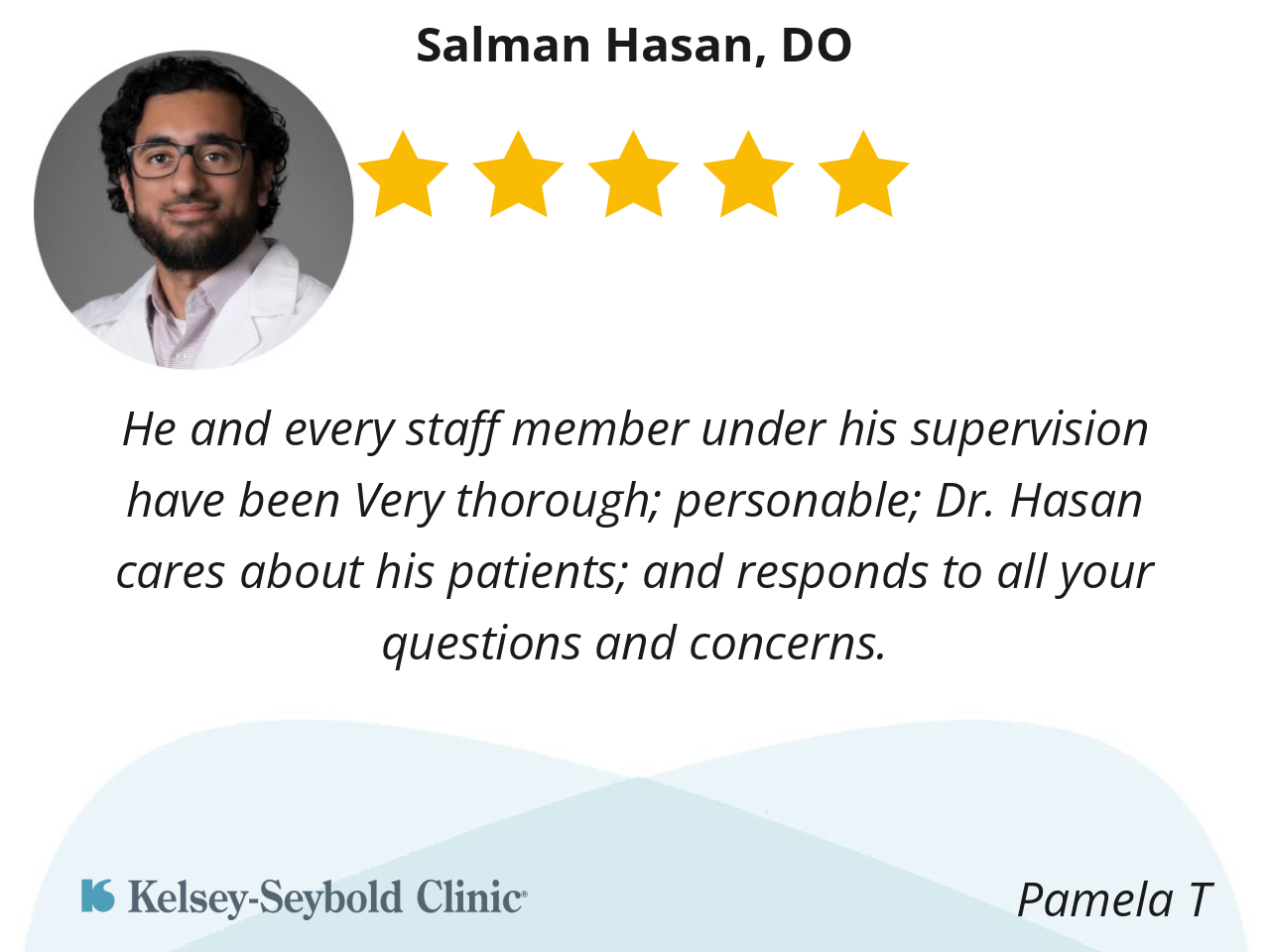 He and every staff member under his supervision have been Very thorough; personable; Dr. Hasan cares about his patients; and responds to all your questions and concerns.