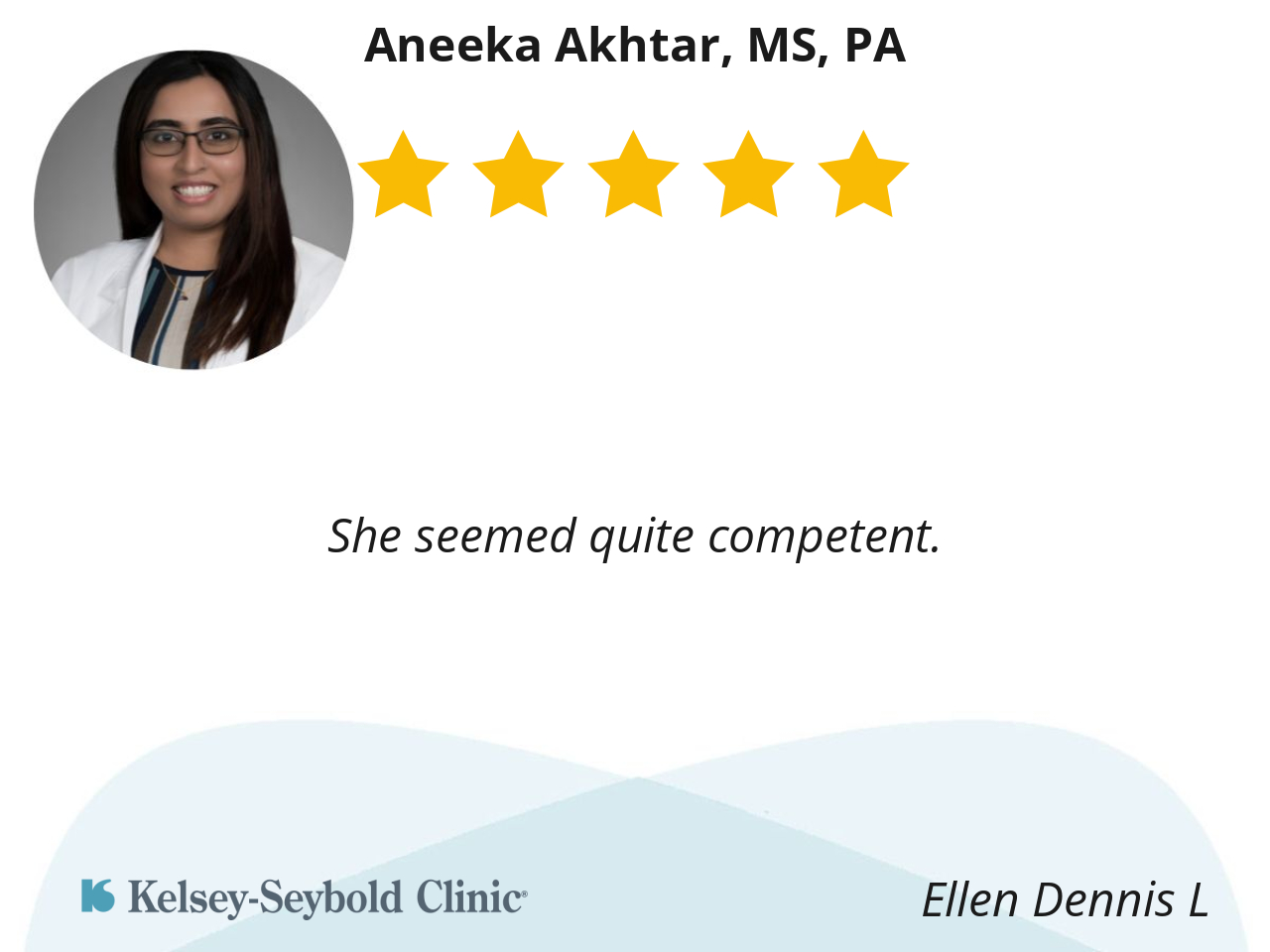 Dr. Akhtar was very professional, listening to my concerns, and doing enough testing to explain the cause of my issue. I was very satisfied with her suggested medications and why they were to help me.