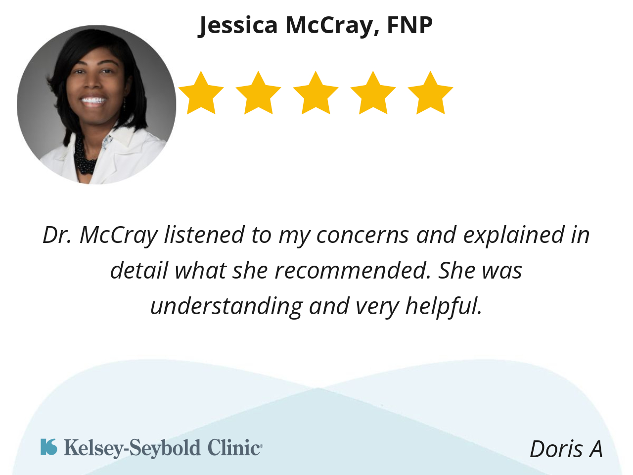 FNP Jessica McCray is very graceful, professional, and patient when she cares for my mother-in-law, Teresa Valdez. She goes out of her way to ask questions to make sure she is doing good.