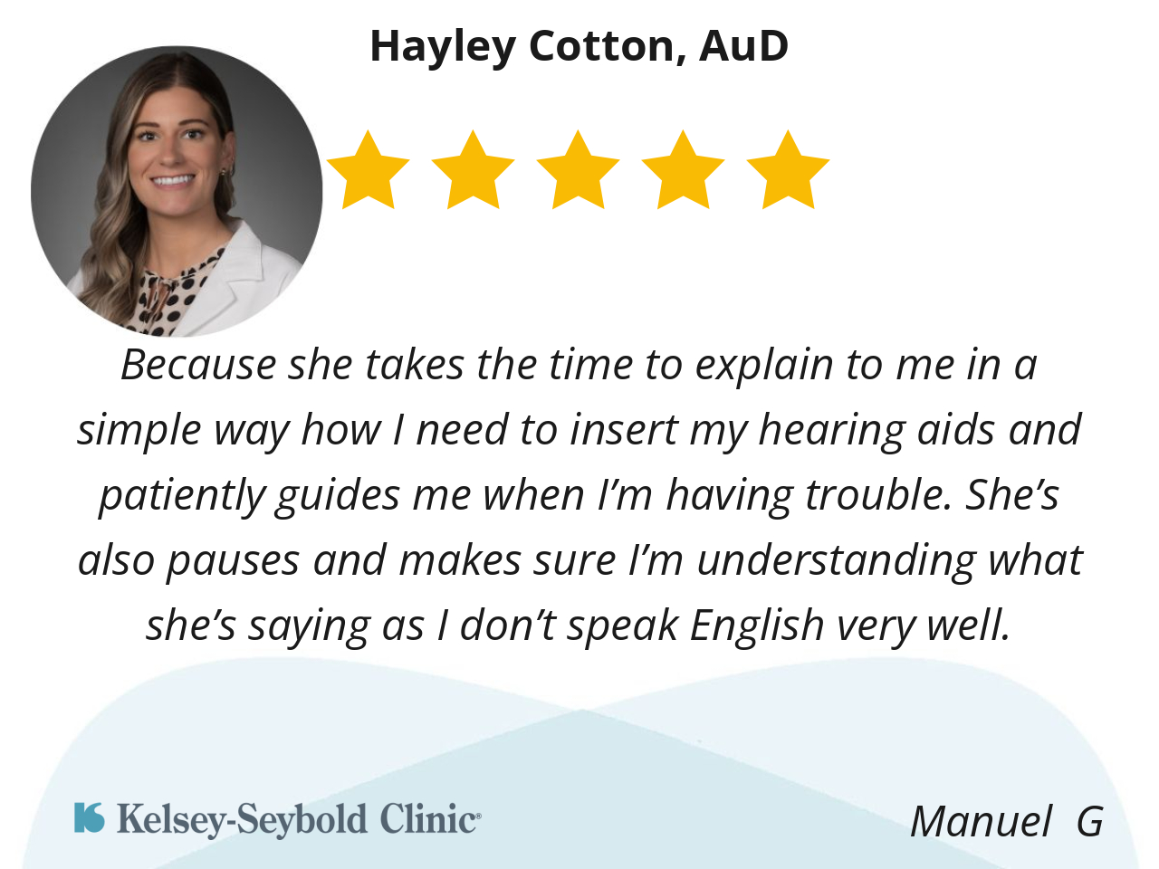 Because she takes the time to explain to me in a simple way how I need to insert my hearing aids and patiently guides me when I’m having trouble. She’s also pauses and makes sure I’m understanding what she’s saying as I don’t speak English very well.
