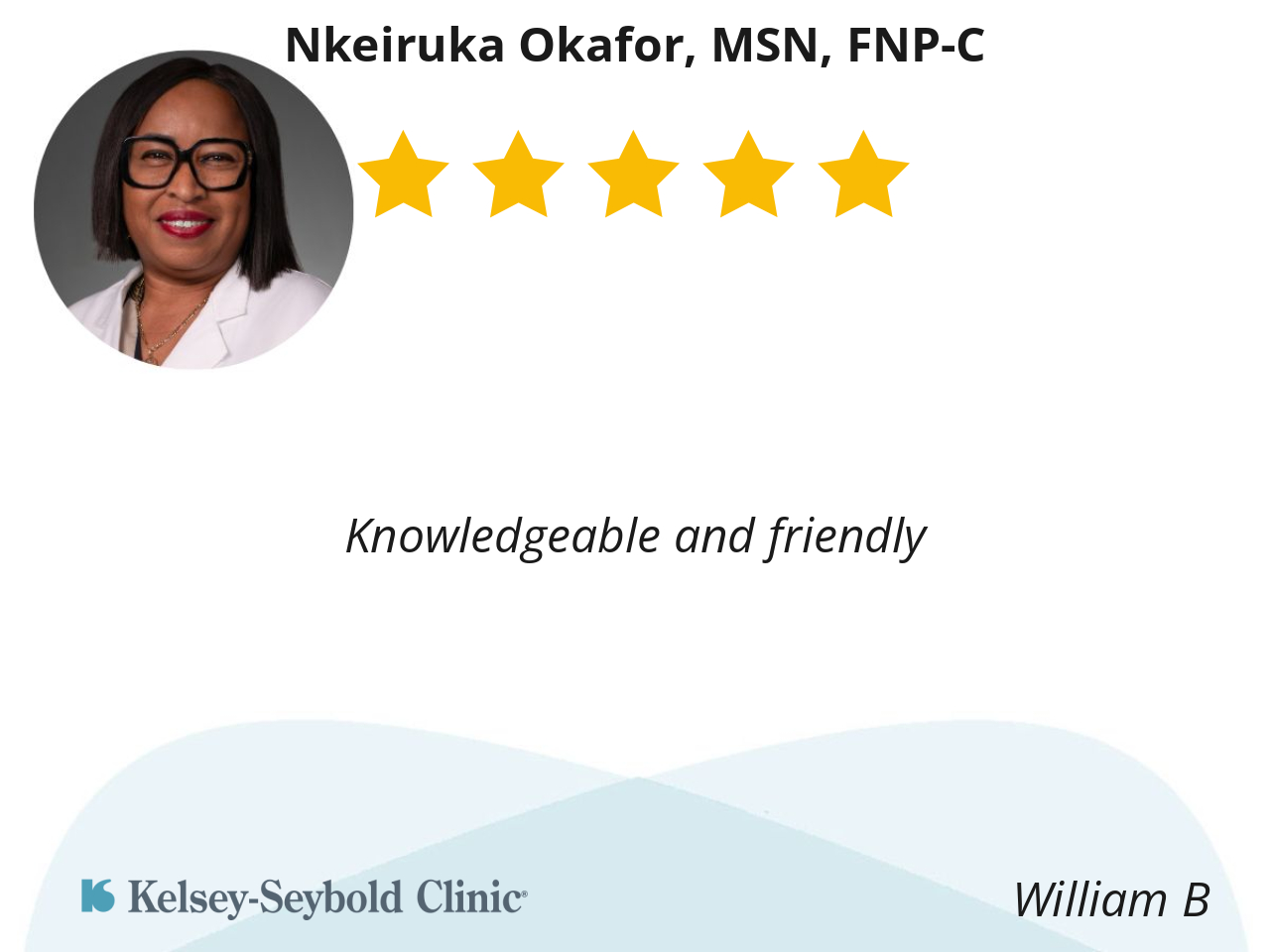 Dr, Okafor provided me with great recommendations for some of the areas I’m struggling in with my health. Dr. Okafor was extremely nice and I felt comfortable talking to her about some of my concerns.