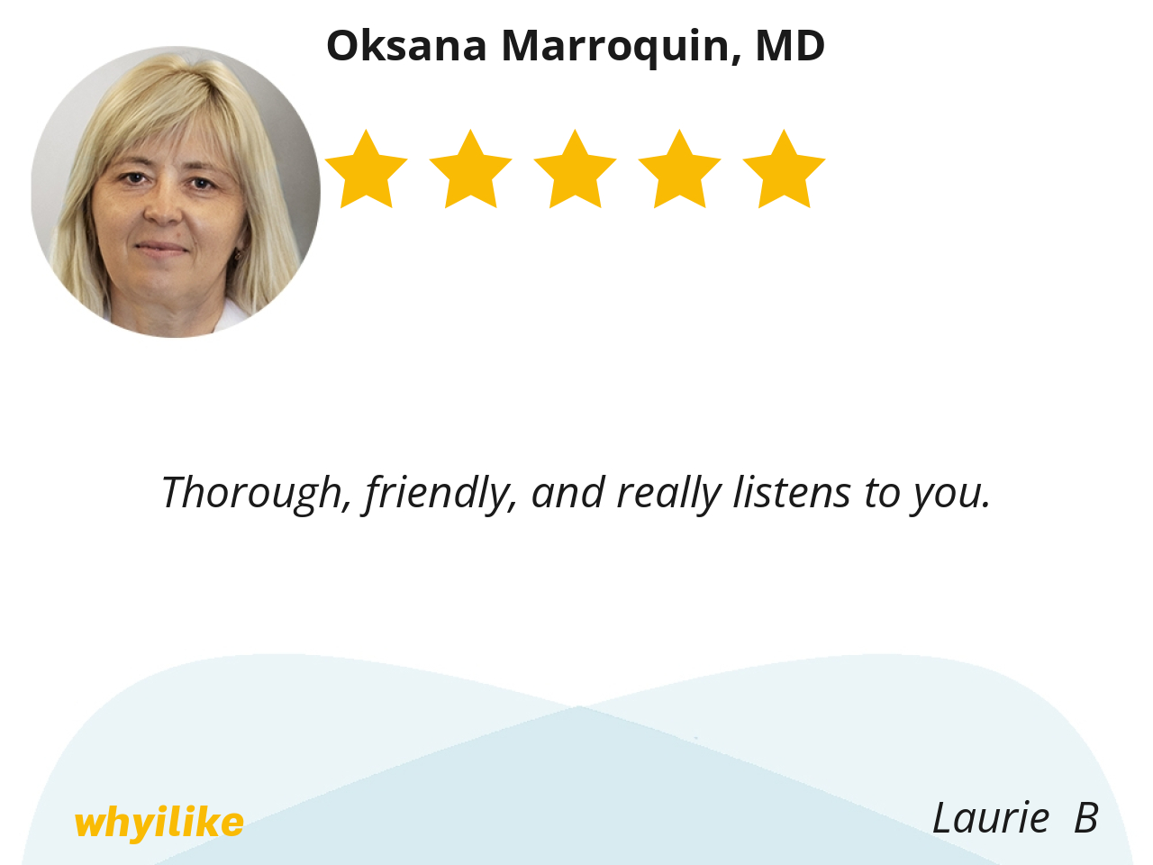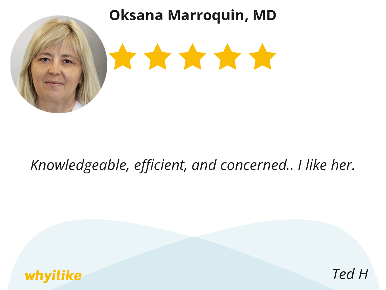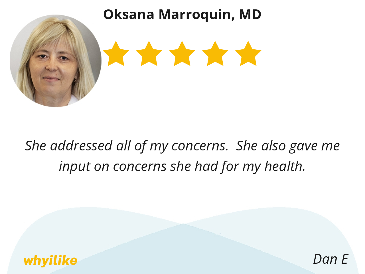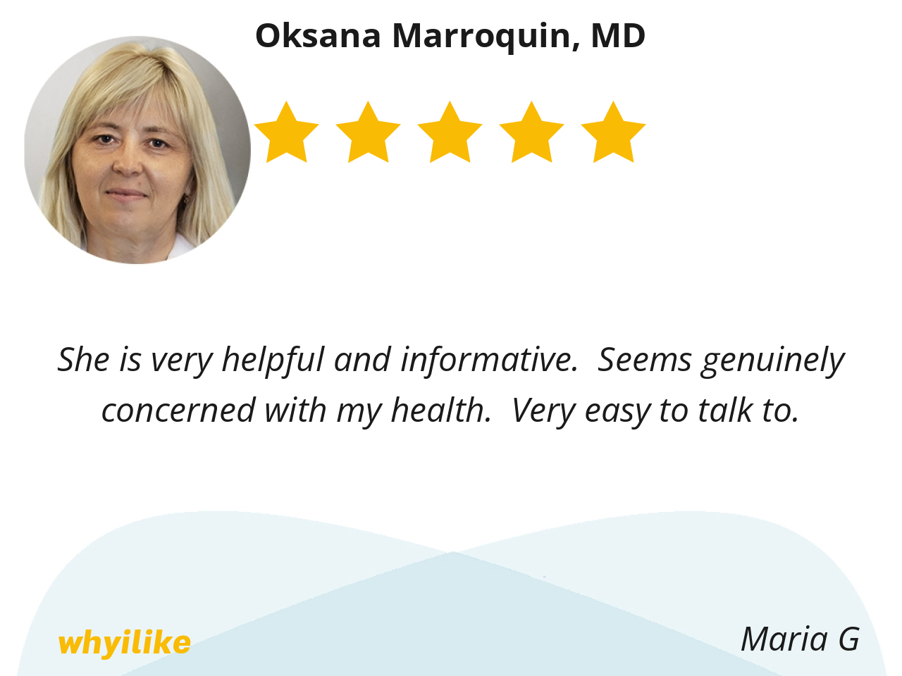 Dr. Marroquin took the time to answer all of my questions and concerns. She gave me good advice, and I respect her opinion. Will recommend her to my friends.