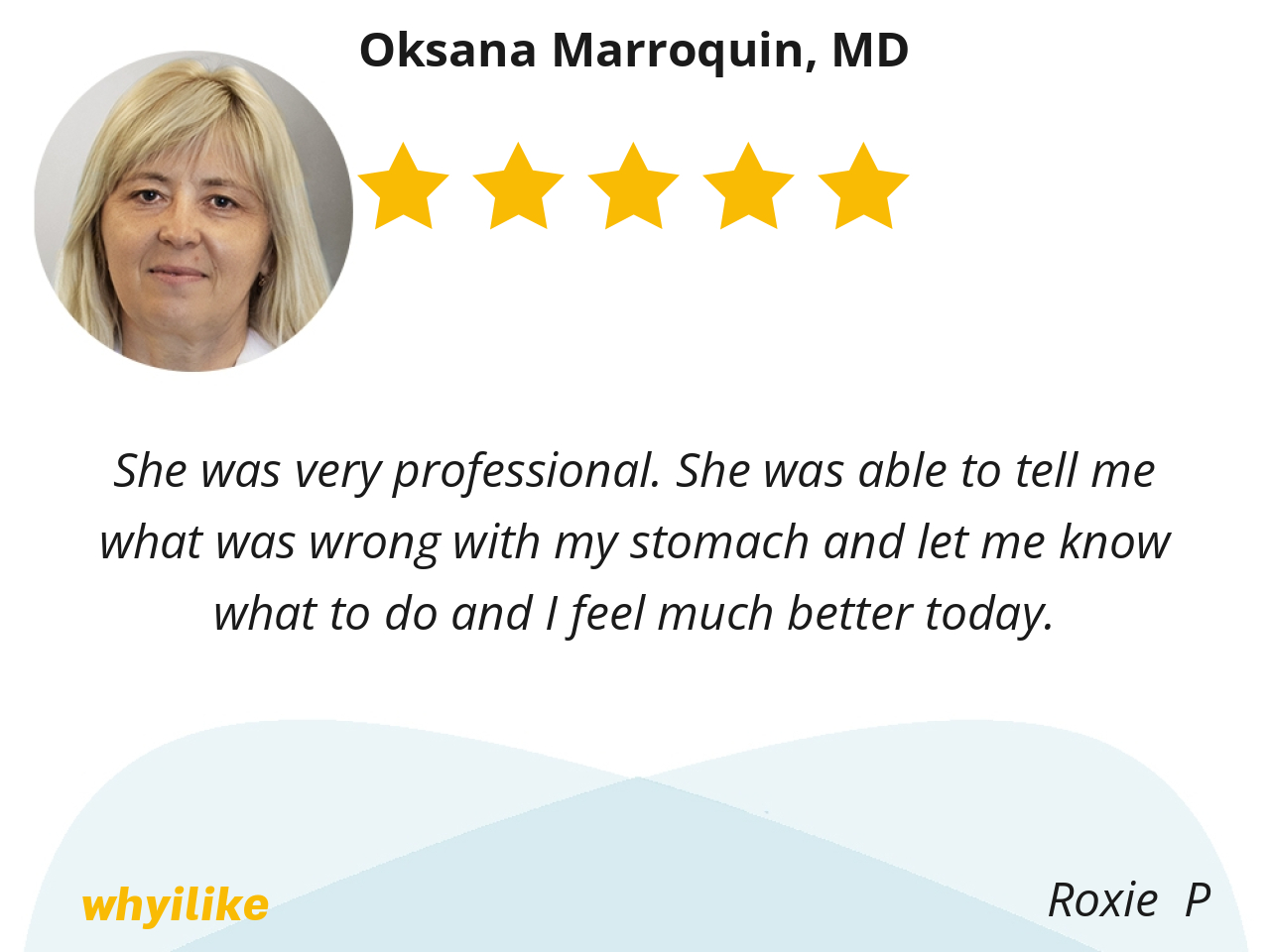 Dr Marroquin is professional, friendly and caring. She listens to you and explains thoroughly the test and/ or prescriptions she is ordering. She is a doctor you can trust.