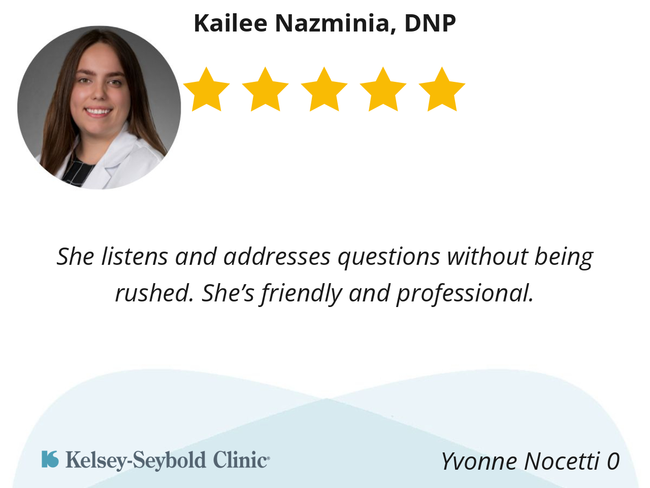 She was very professional and kind. She took her time to explain everything we discussed, from tests, labs, vaccines, my family history. She gave me and my husband a chance to ask questions. She smiled and had a warm comforting disposition. This was my first visit being a patient at Kelsey Seybold and I felt comfortable with her and I'm pleased with her care.