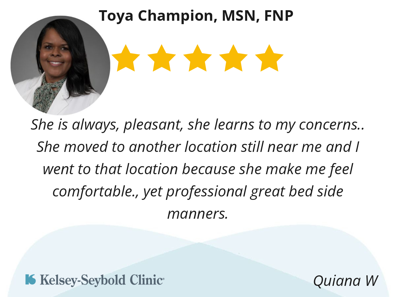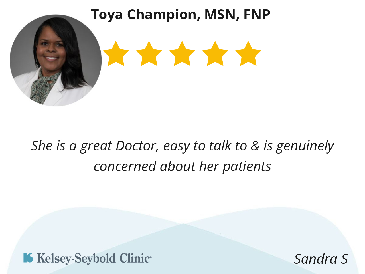She was awesome 👏 she talk with me she listen to me and she took care of all of my concerns. Thank you, Dr. Champion. ❤️