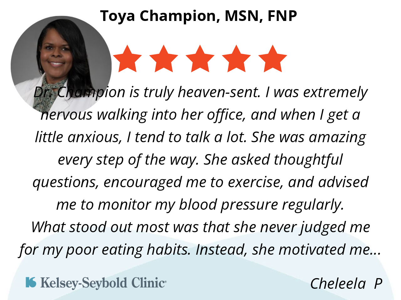 Dr. Champion is truly heaven-sent. I was extremely nervous walking into her office, and when I get a little anxious, I tend to talk a lot. She was amazing every step of the way. She asked thoughtful questions, encouraged me to exercise, and advised me to monitor my blood pressure regularly.