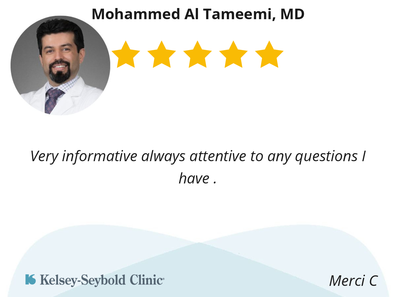 Dr. Mohammed Al Tammeemi takes the time to explain fully and makes sure I understand all of my meds and diabetes. I leave his office fully understanding. I'm very happy to have him as my Endocrinologist.