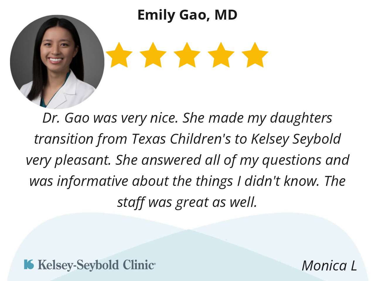 Dr. Gao was very nice. She made my daughters transition from Texas Children's to Kelsey Seybold very pleasant. She answered all of my questions and was informative about the things I didn't know. The staff was great as well.
