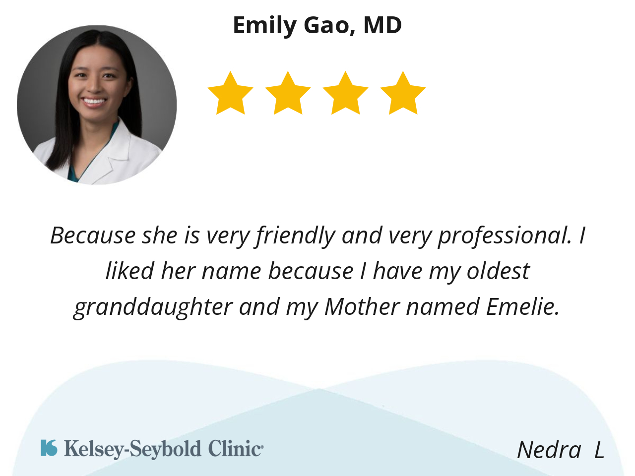 Because she is very friendly and very professional. I liked her name because I have my oldest granddaughter and my Mother named Emelie.