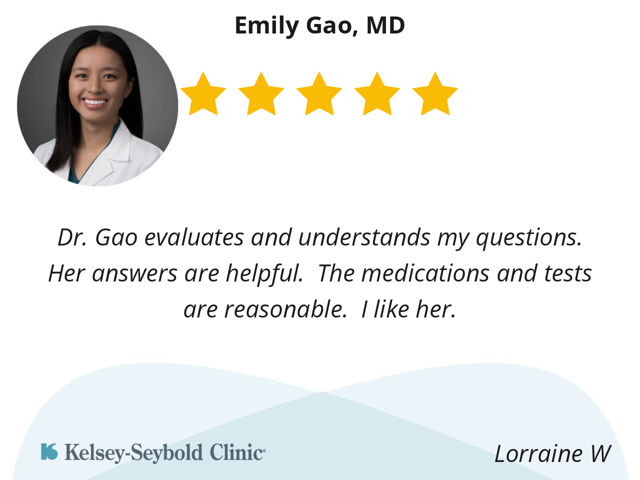 Dr. Gao evaluates and understands my questions. Her answers are helpful. The medications and tests are reasonable. I like her.