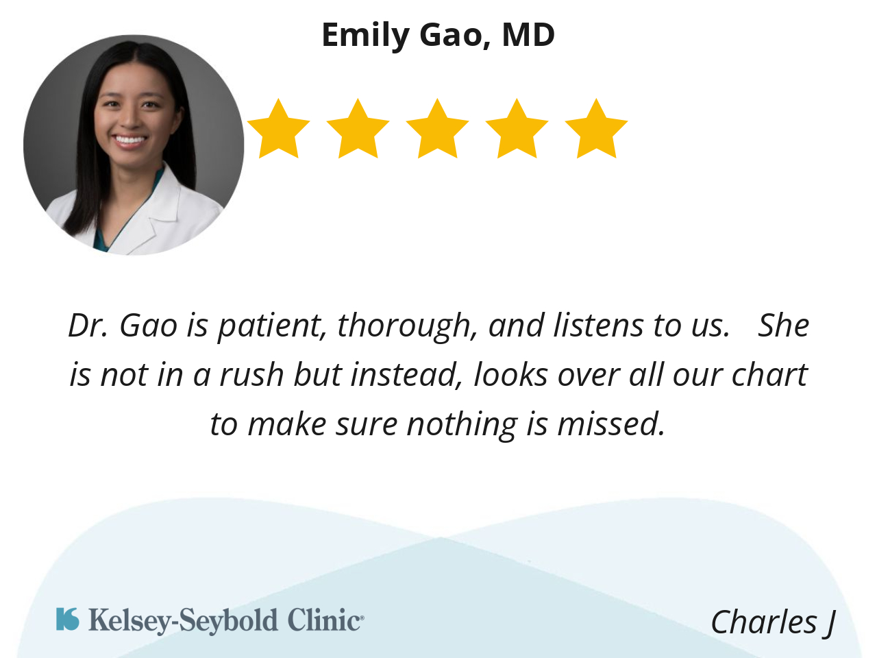Dr. Gao is patient, thorough, and listens to us. She is not in a rush but instead, looks over all our chart to make sure nothing is missed.
