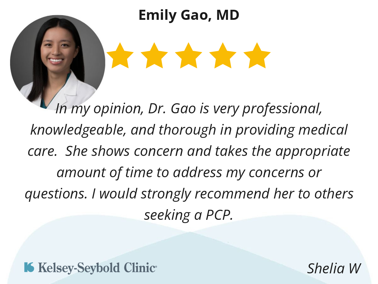 In my opinion, Dr. Gao is very professional, knowledgeable, and thorough in providing medical care. She shows concern and takes the appropriate amount of time to address my concerns or questions. I would strongly recommend her to others seeking a PCP.