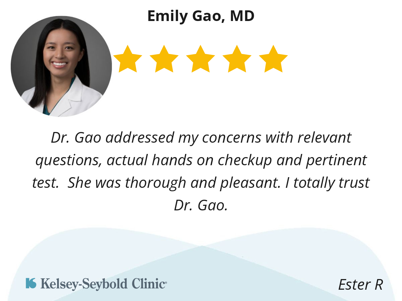 Dr. Gao addressed my concerns with relevant questions, actual hands on checkup and pertinent test. She was thorough and pleasant. I totally trust Dr. Gao.