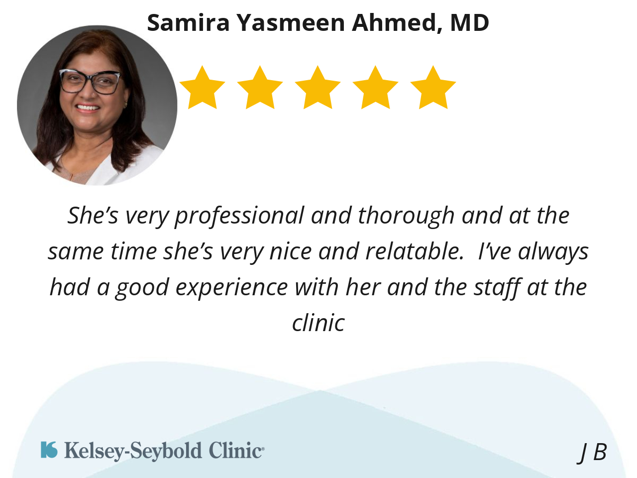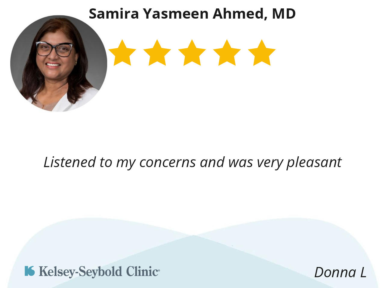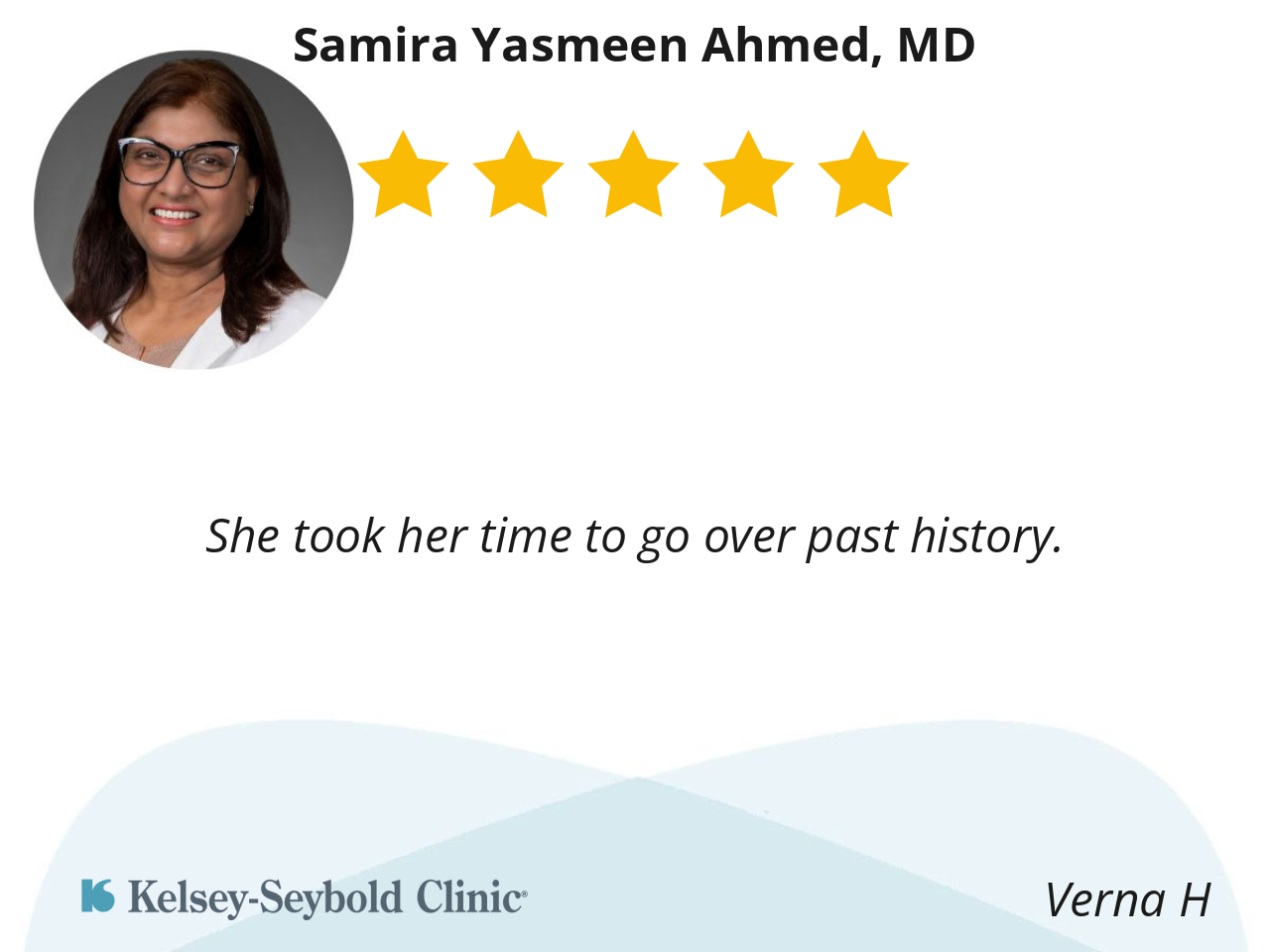 Dr. Samira Ahmed is always welcoming, supportive, informative and caring. She makes sure I’m up to date on my medications, my lab work and my yearly vaccinations. She keeps up on my care from my entire Kelsey Seybold medical group.