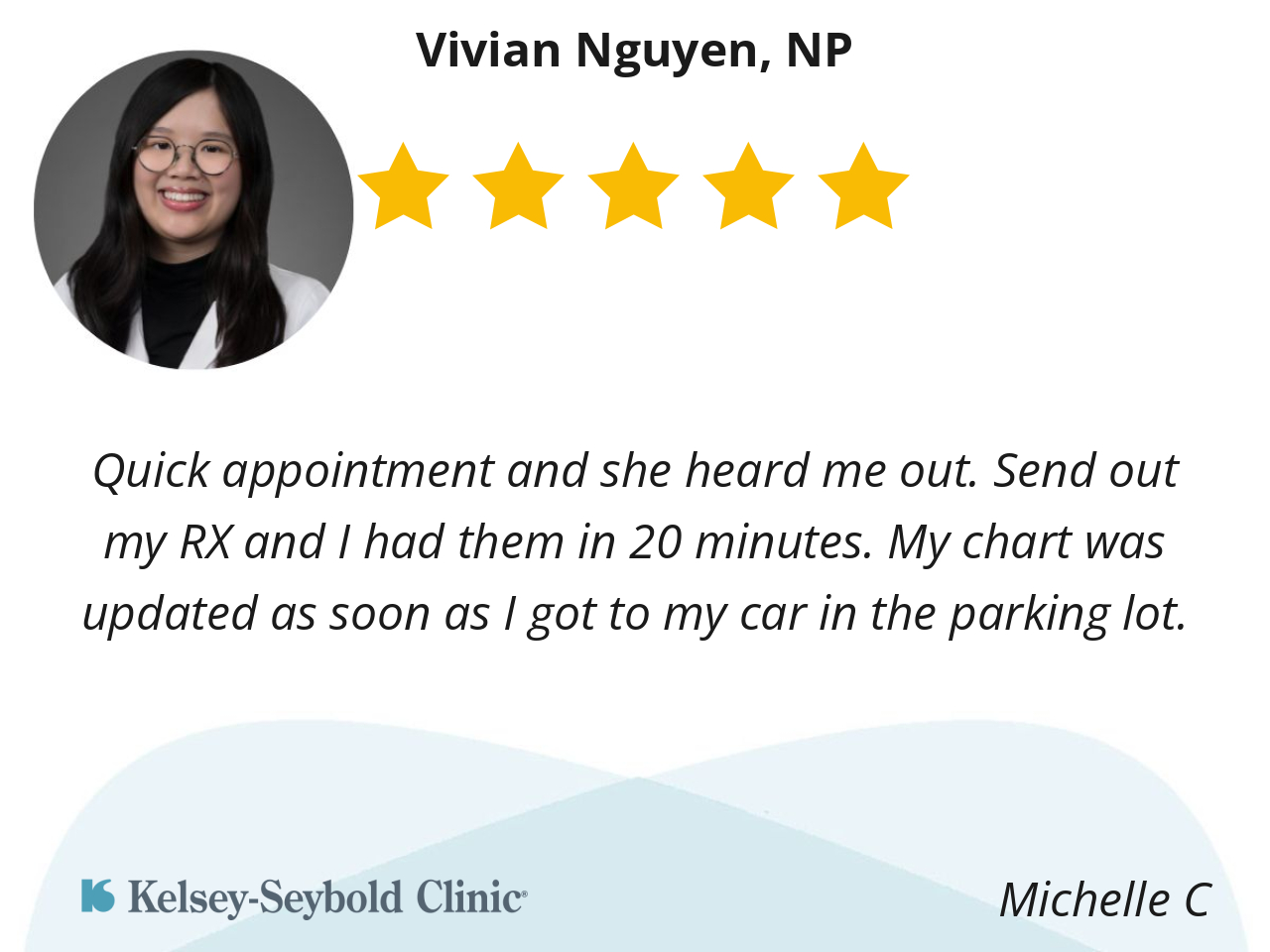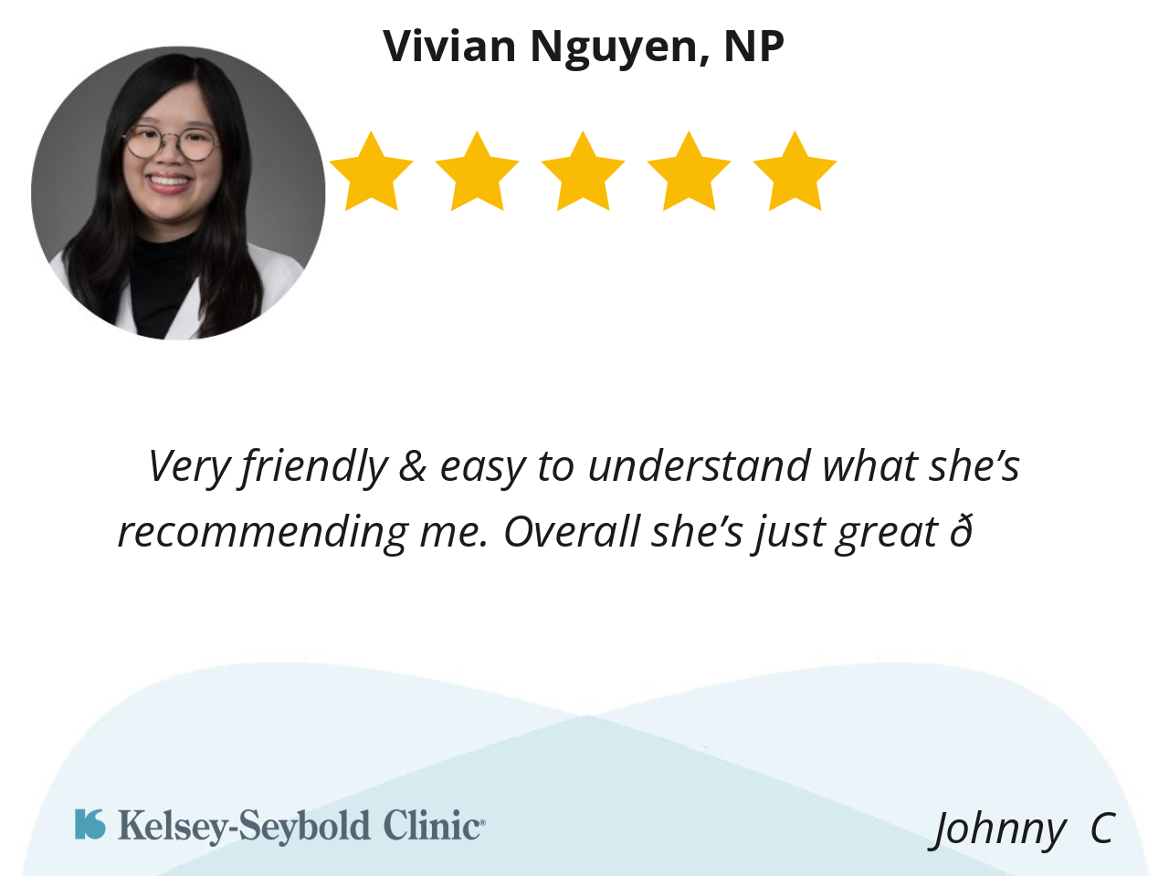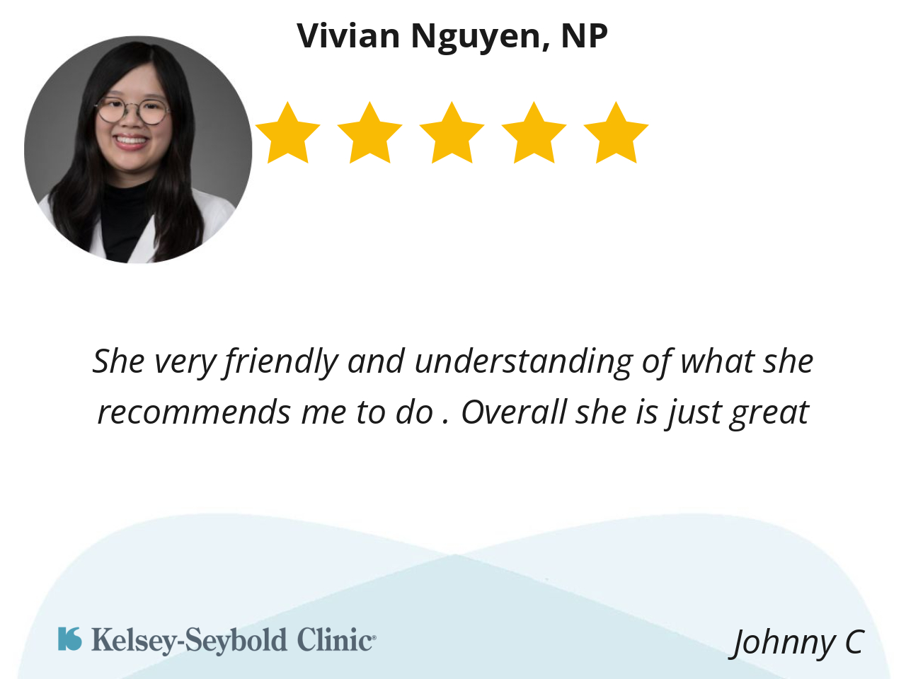 This was my first time seeing Nguyen NP. NP Has friendly personality, ask questions of my wellbeing and if I had a questions about anything. Overall good visit .
