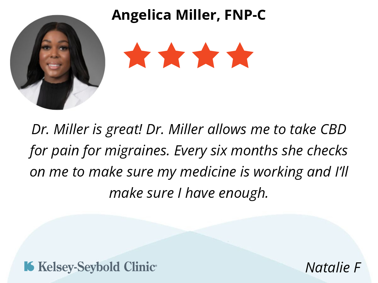 Dr. Miller is great! Dr. Miller allows me to take CBD for pain for migraines. Every six months she checks on me to make sure my medicine is working and I’ll make sure I have enough.