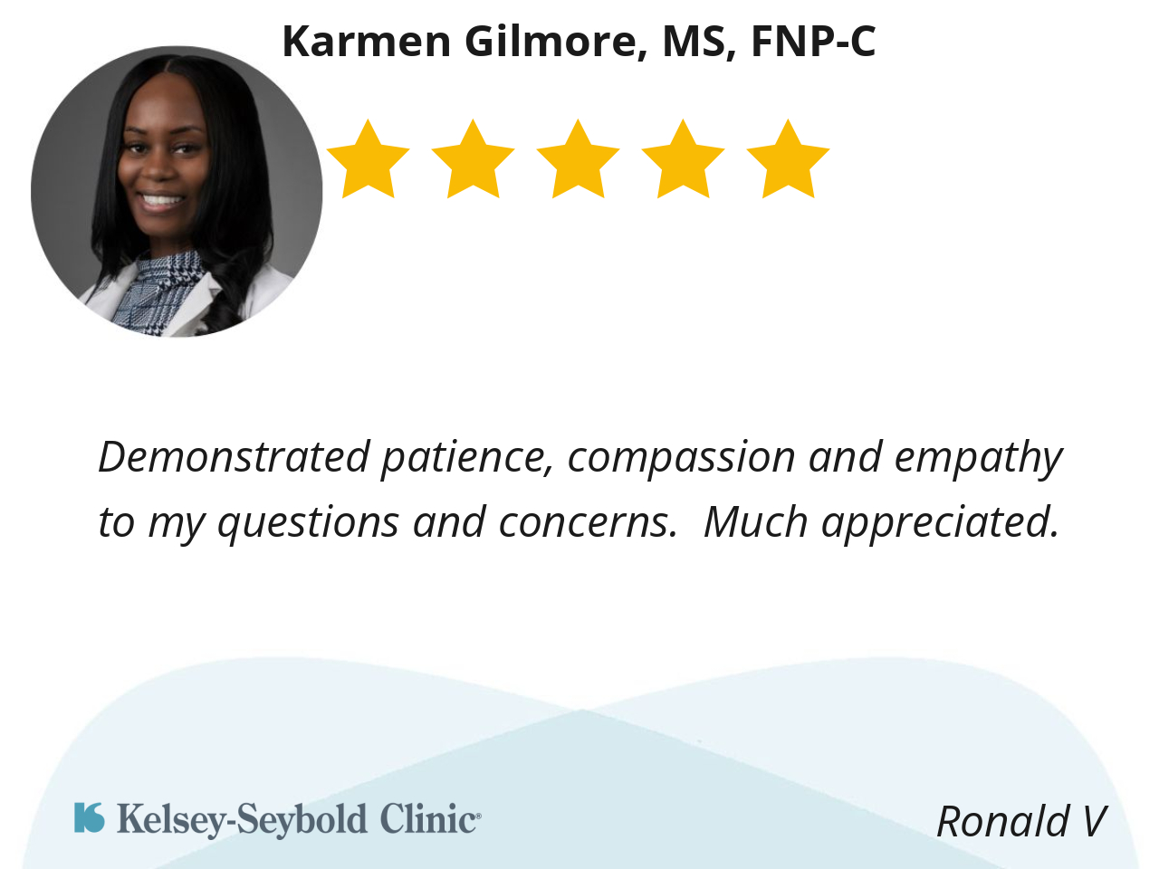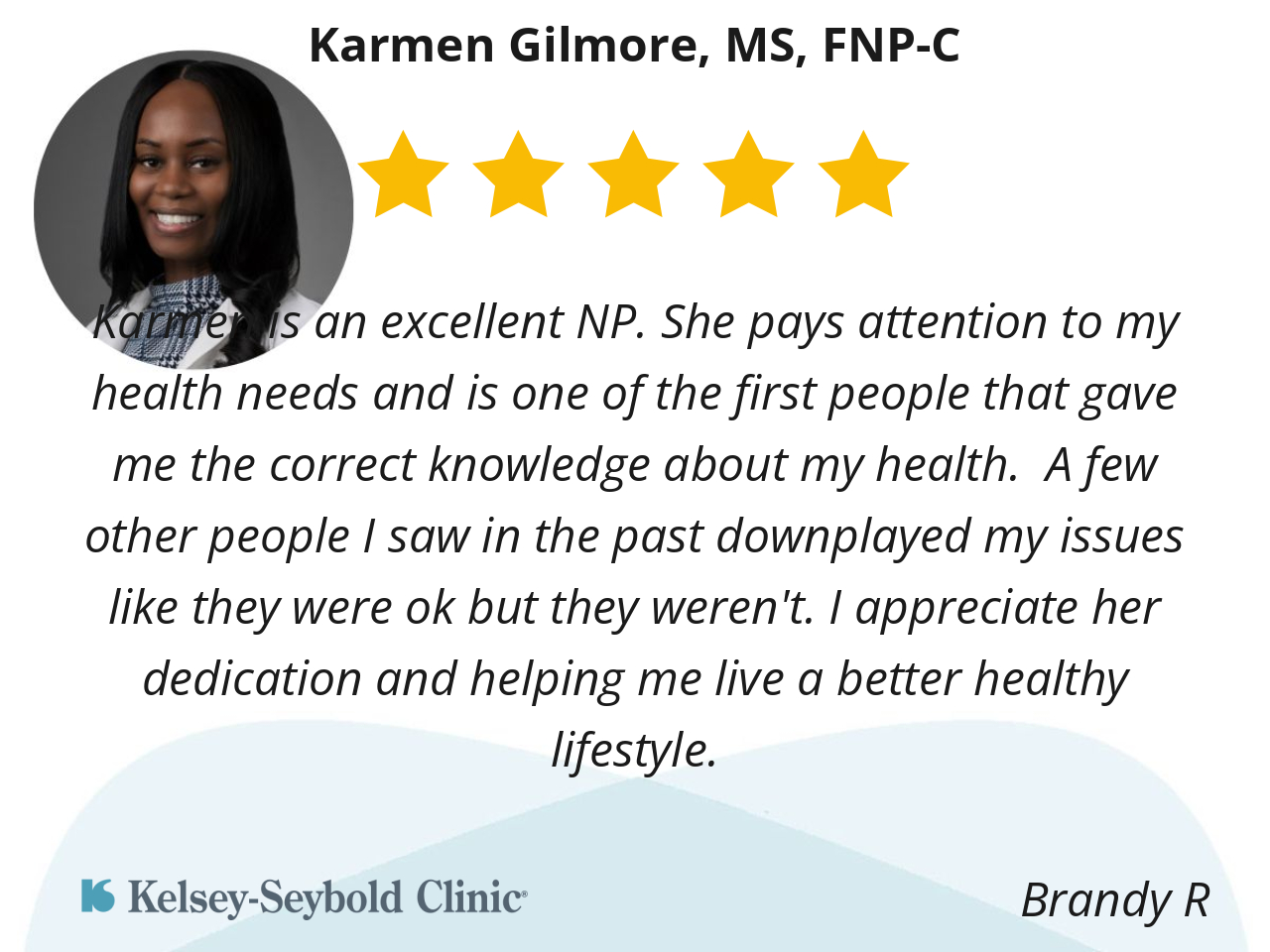 Dr. Gilmore is the best physician I have seen in a very long time. She is very attentive and listens to my needs. She always makes great recommendations and I never feel rushed during my visits. I will continue to see her as long as she is at Kelsey.