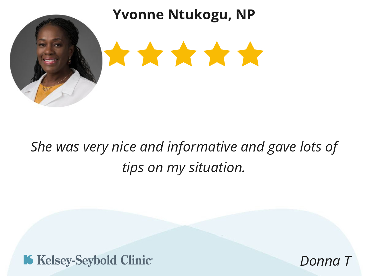She is very patient & knowledgeable. She has genuine interest in the health needs & care for her patients. She also makes sure her patients have a clear understanding of their health. I'm happy to have her help.