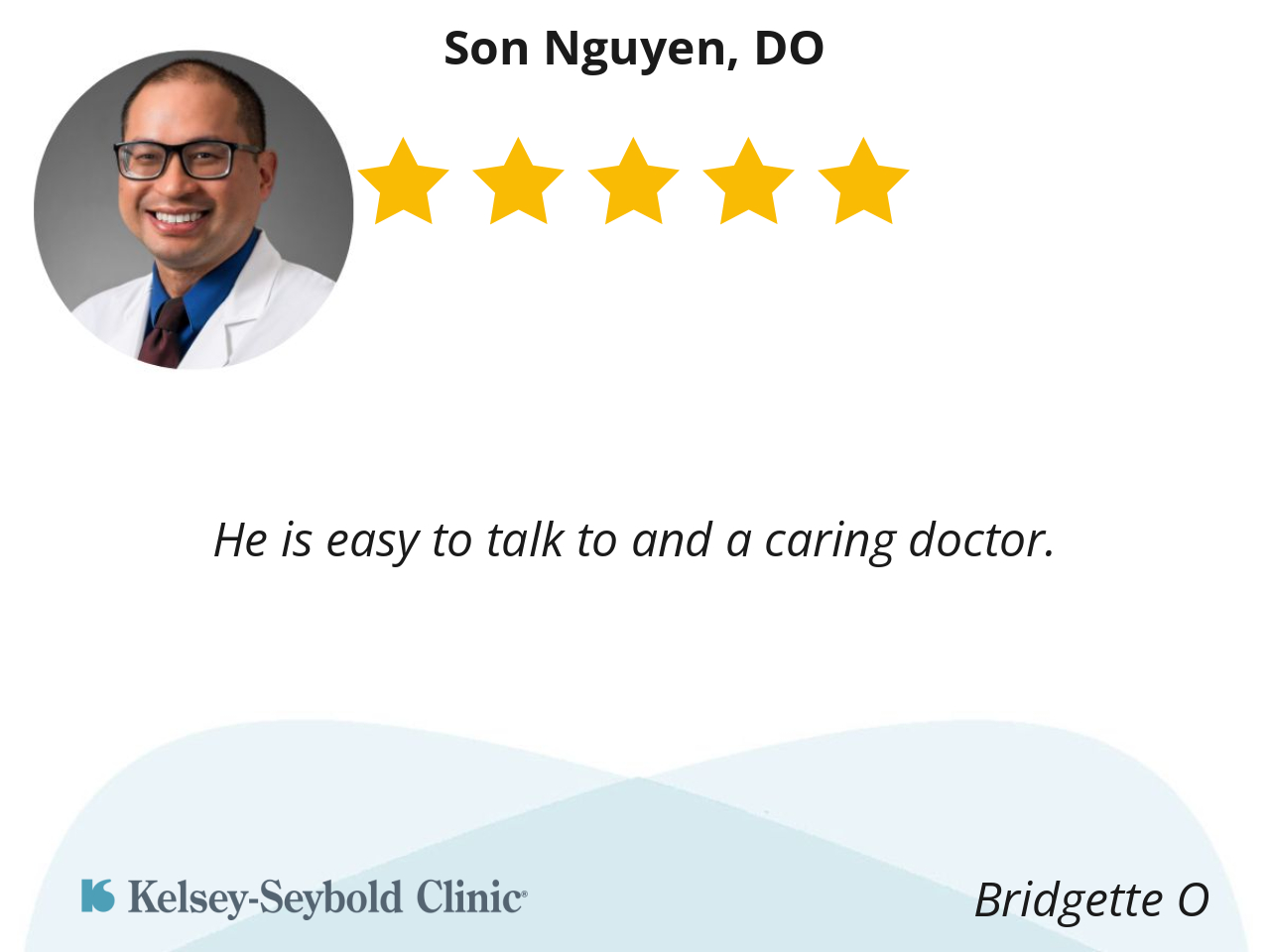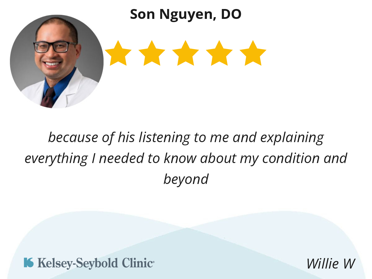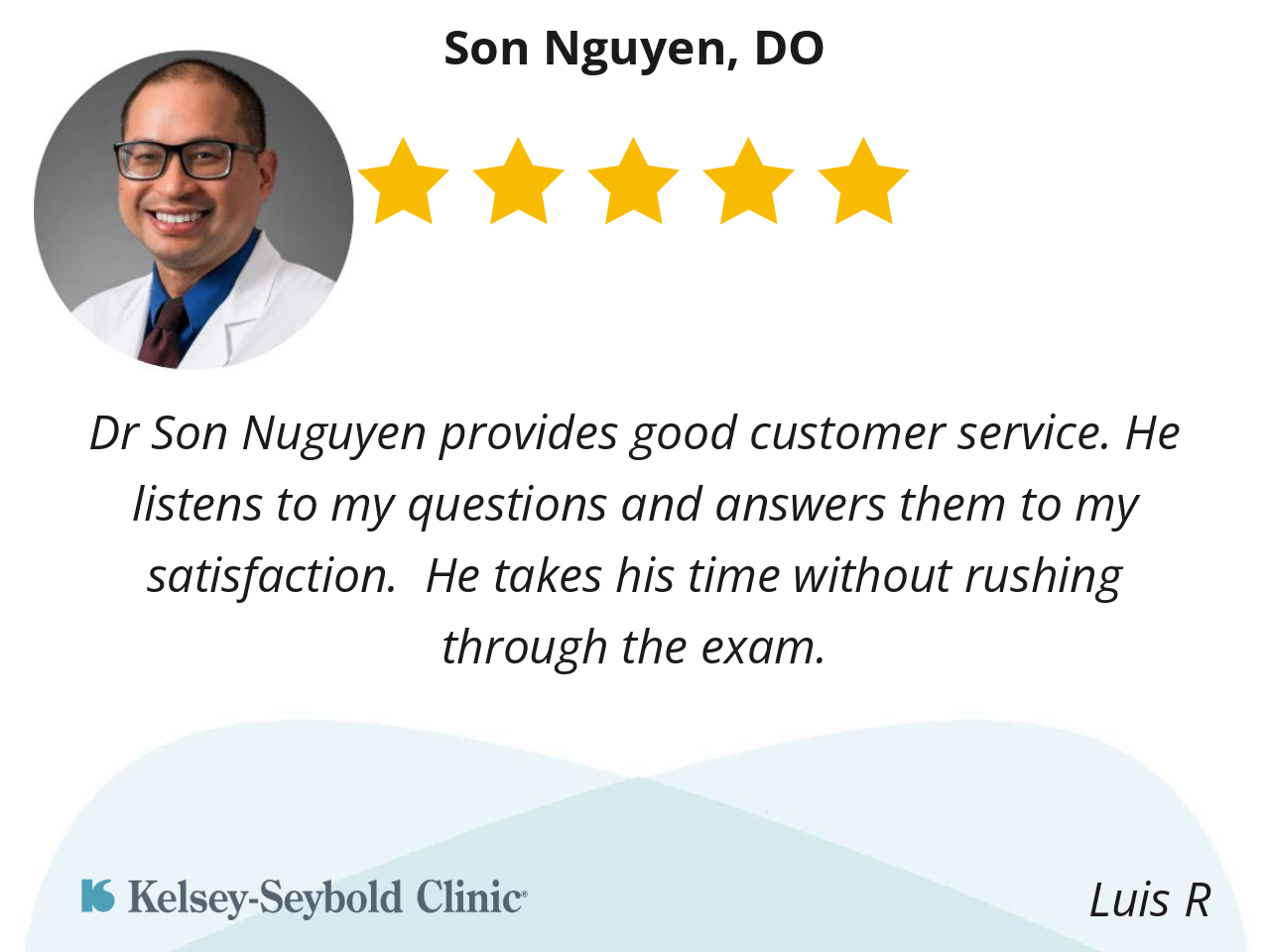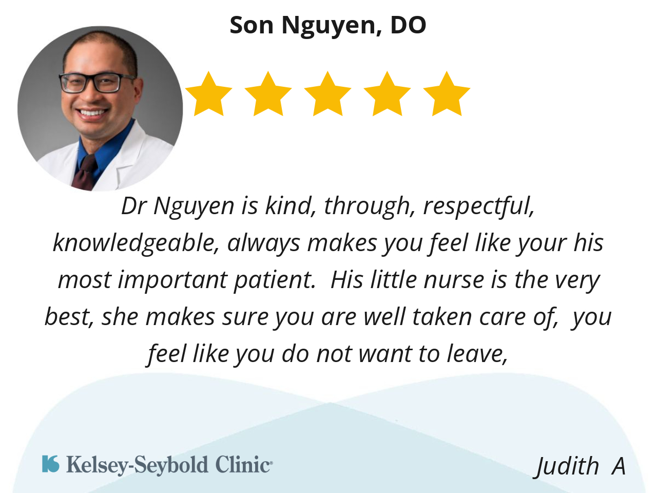 Oh my Dr Son Nyguen, is the sweetest doctor I’ve ever had. He’s very attentive, he listens closely to every question I have he answers to where I completely understand him with my concerns. He takes his time each time I see him, I don’t feel rushed at all, and I love that about him..