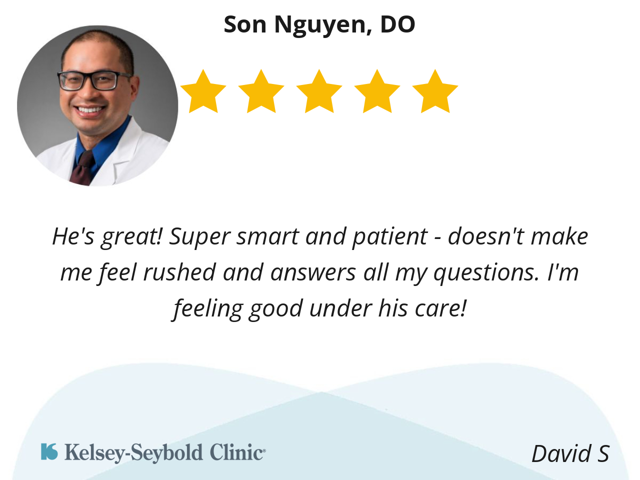 Dr. Nguyen is patient and really listens. He took my concerns seriously and helped me to understand the mechanics of my illness and the testing required. I appreciate that he explains everything thoroughly in a way that is easy to understand in a stressful situation.