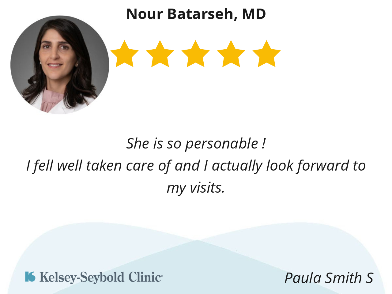 Because she’s not just a doctor, she genuinely cares. I appreciate Dr. Nour’s professionalism, her depth of knowledge, and the confidence she brings to every situation. She is consistent, reliable, and always focused on what’s best for her patients.