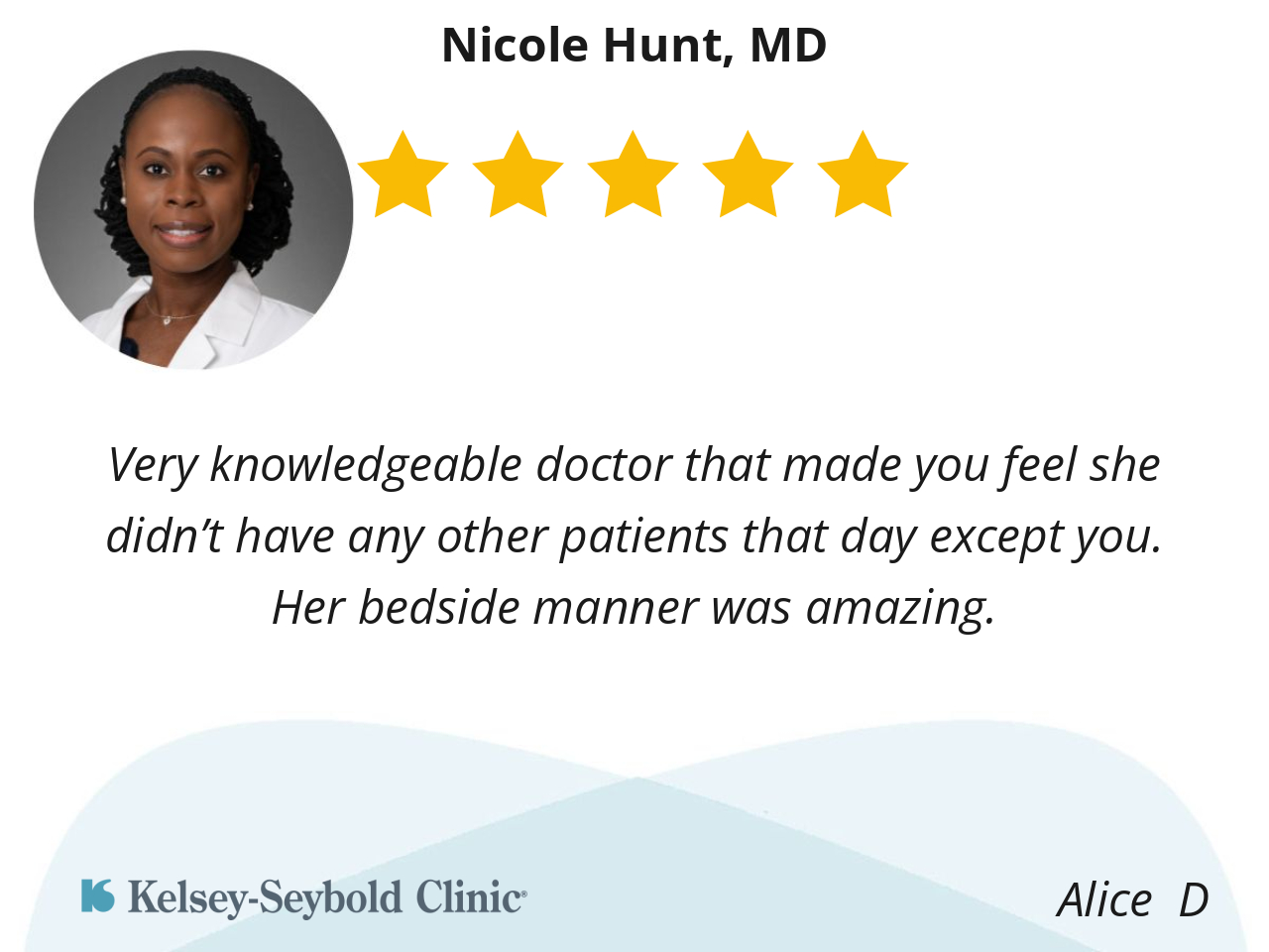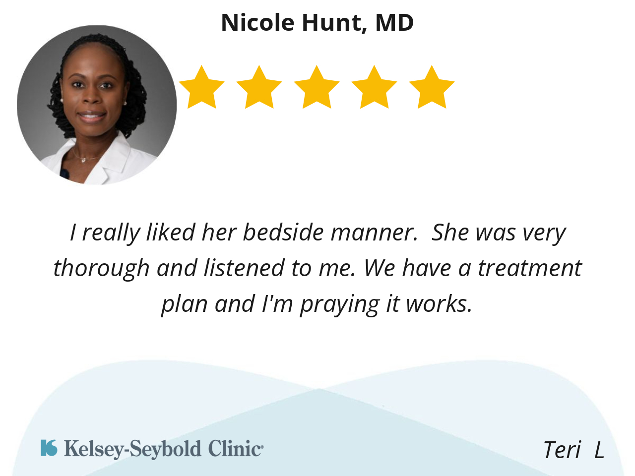 Dr. Hunt was very professional and listened to my concerns. I found her to be very pleasant and knowledgeable.