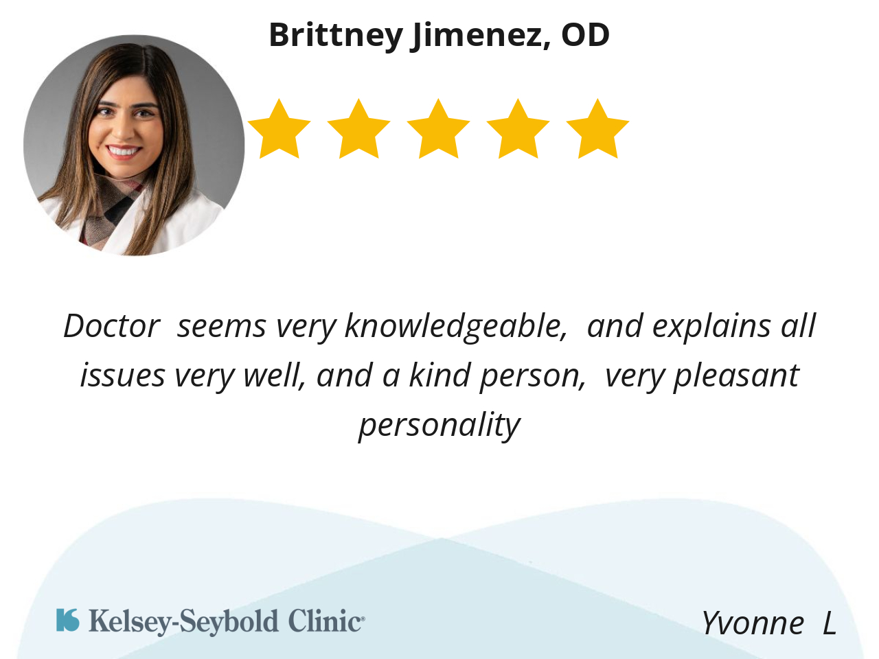 Dr. Jimenez is a great Dr. she explains everything clearly and is very knowledgeable.