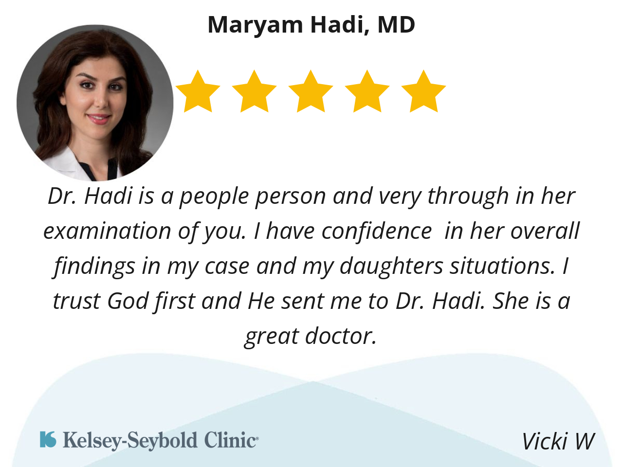 Dr. Hadi is a people person and very through in her examination of you. I have confidence in her overall findings in my case and my daughters situations. I trust God first and He sent me to Dr. Hadi. She is a great doctor.