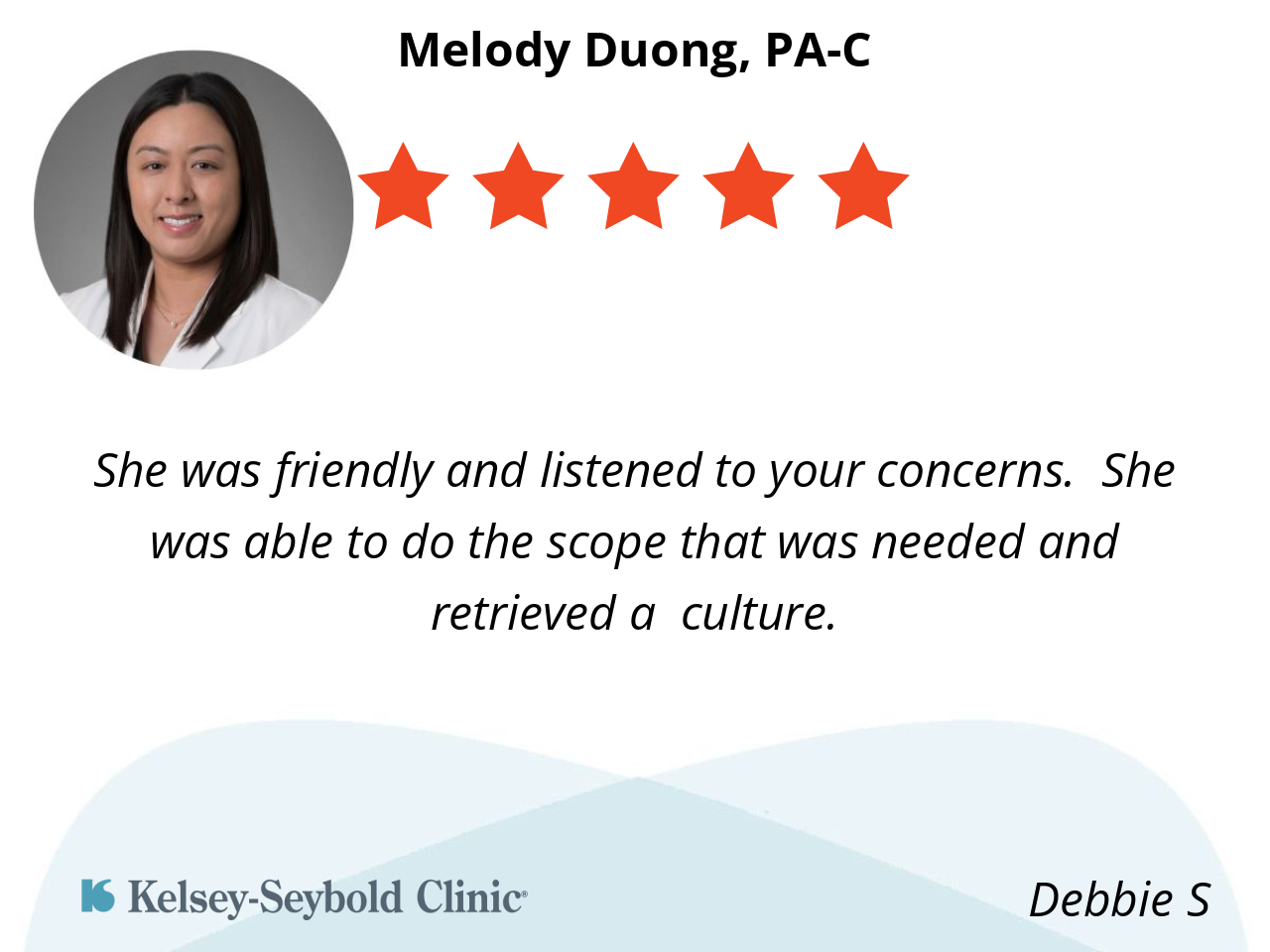 She was friendly and listened to your concerns. She was able to do the scope that was needed and retrieved a culture.