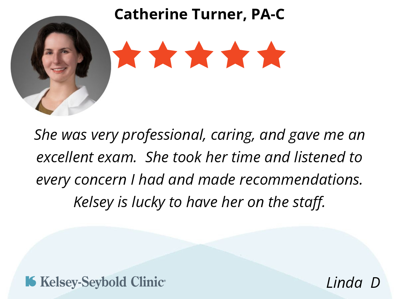 She was very professional, caring, and gave me an excellent exam. She took her time and listened to every concern I had and made recommendations. Kelsey is lucky to have her on the staff.