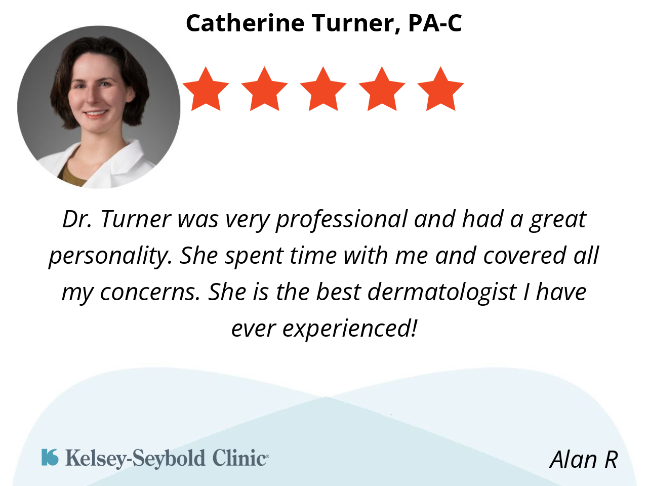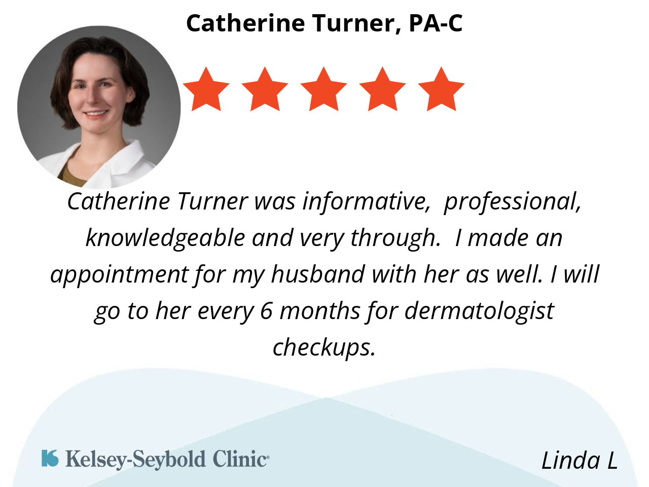 Catherine Turner was informative, professional, knowledgeable and very through. I made an appointment for my husband with her as well. I will go to her every 6 months for dermatologist checkups.