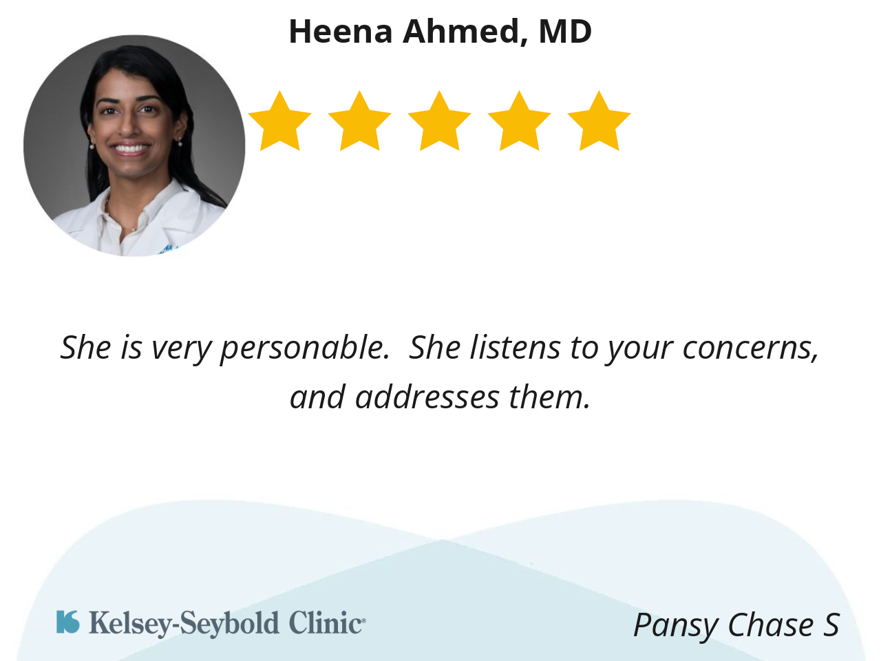 Heena Ahmed, MD listens and finds solutions to help with my pain. She is very kind and caring.