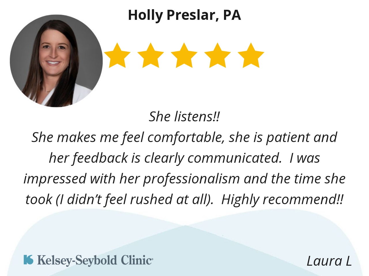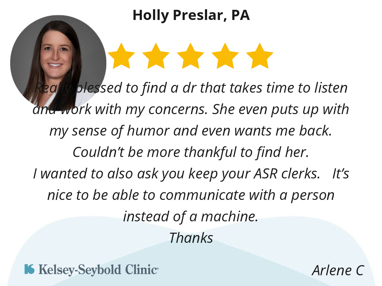 Really blessed to find a dr that takes time to listen and work with my concerns. She even puts up with my sense of humor and even wants me back. Couldn’t be more thankful to find her.