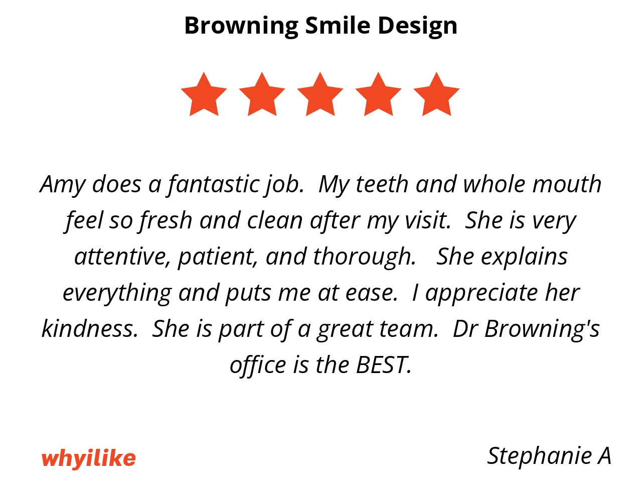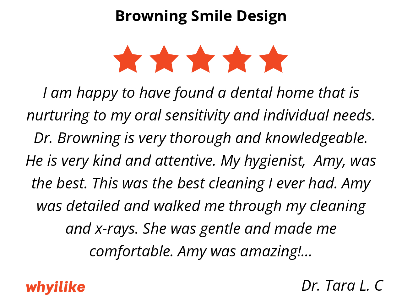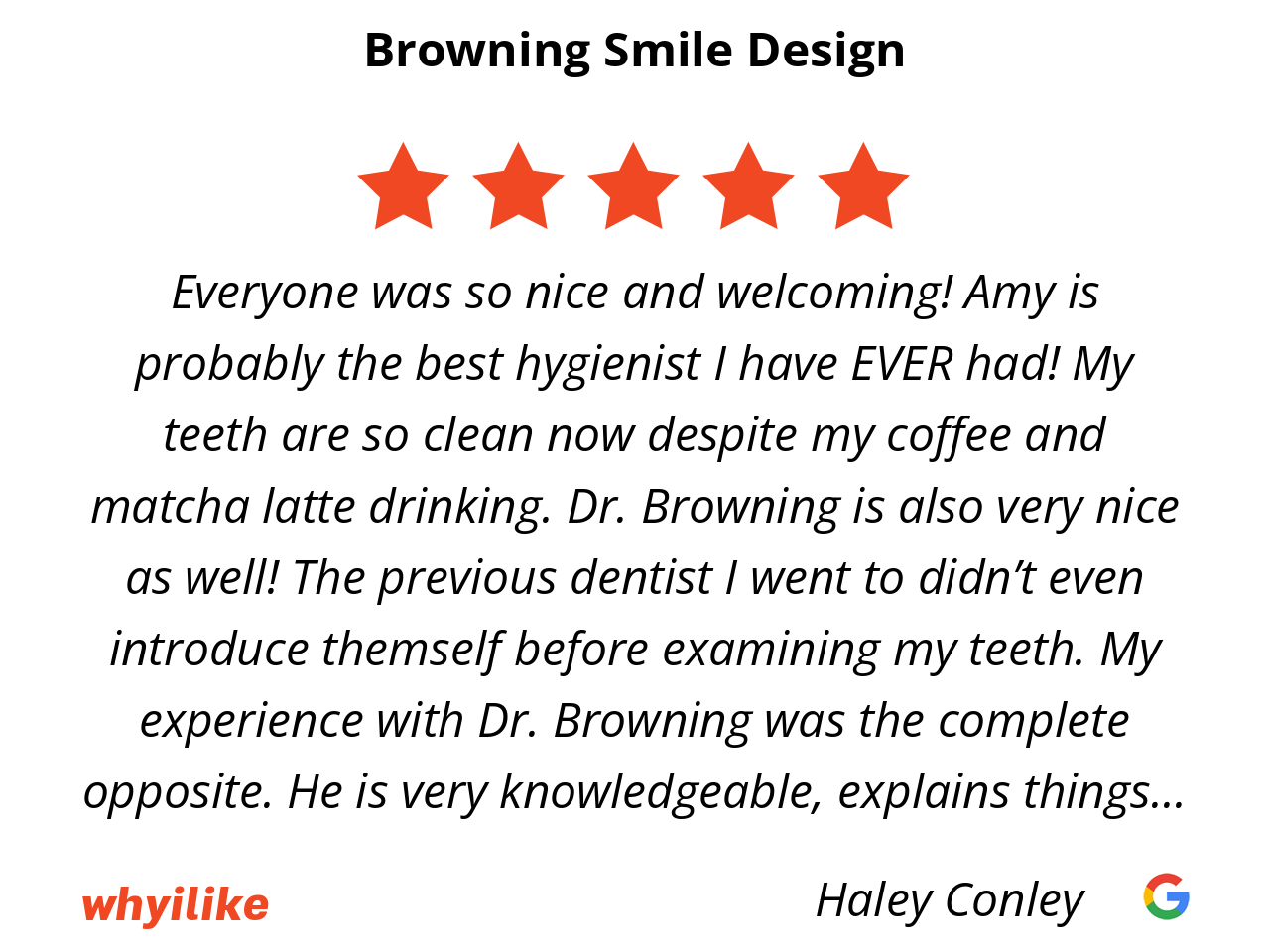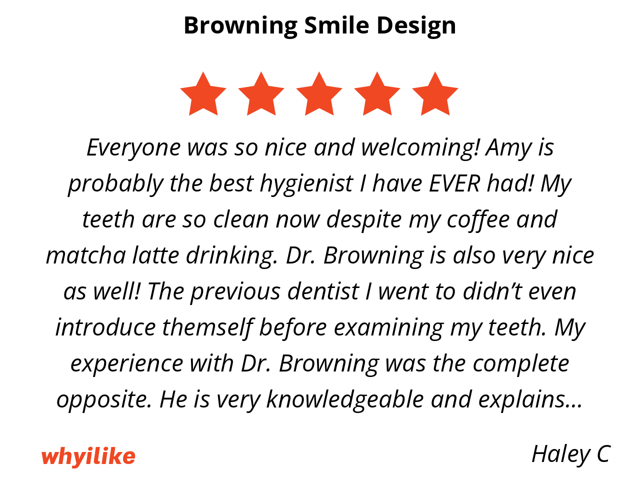 Everyone was so nice and welcoming! Amy is probably the best hygienist I have EVER had! My teeth are so clean now despite my coffee and matcha latte drinking. Dr. Browning is also very nice as well! The previous dentist I went to didn’t even introduce themself before examining my teeth. My experience with Dr. Browning was the complete opposite. He is very knowledgeable, explains things well and is honest. He even has a sense of humor! Can’t wait to continue with my new dentist and hygienist. Also the office is very nice as well! I would highly recommend Browning Smile Design to anyone!