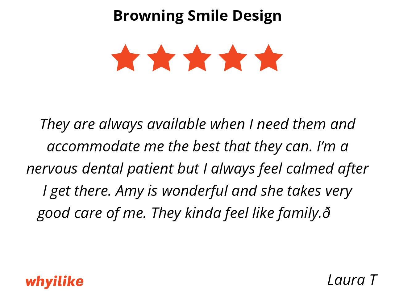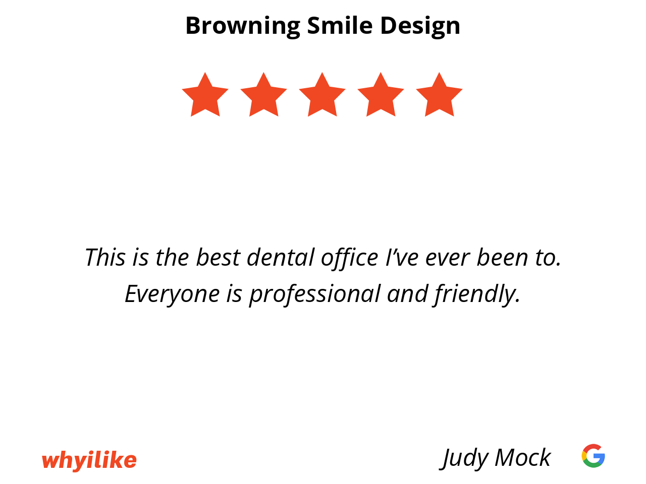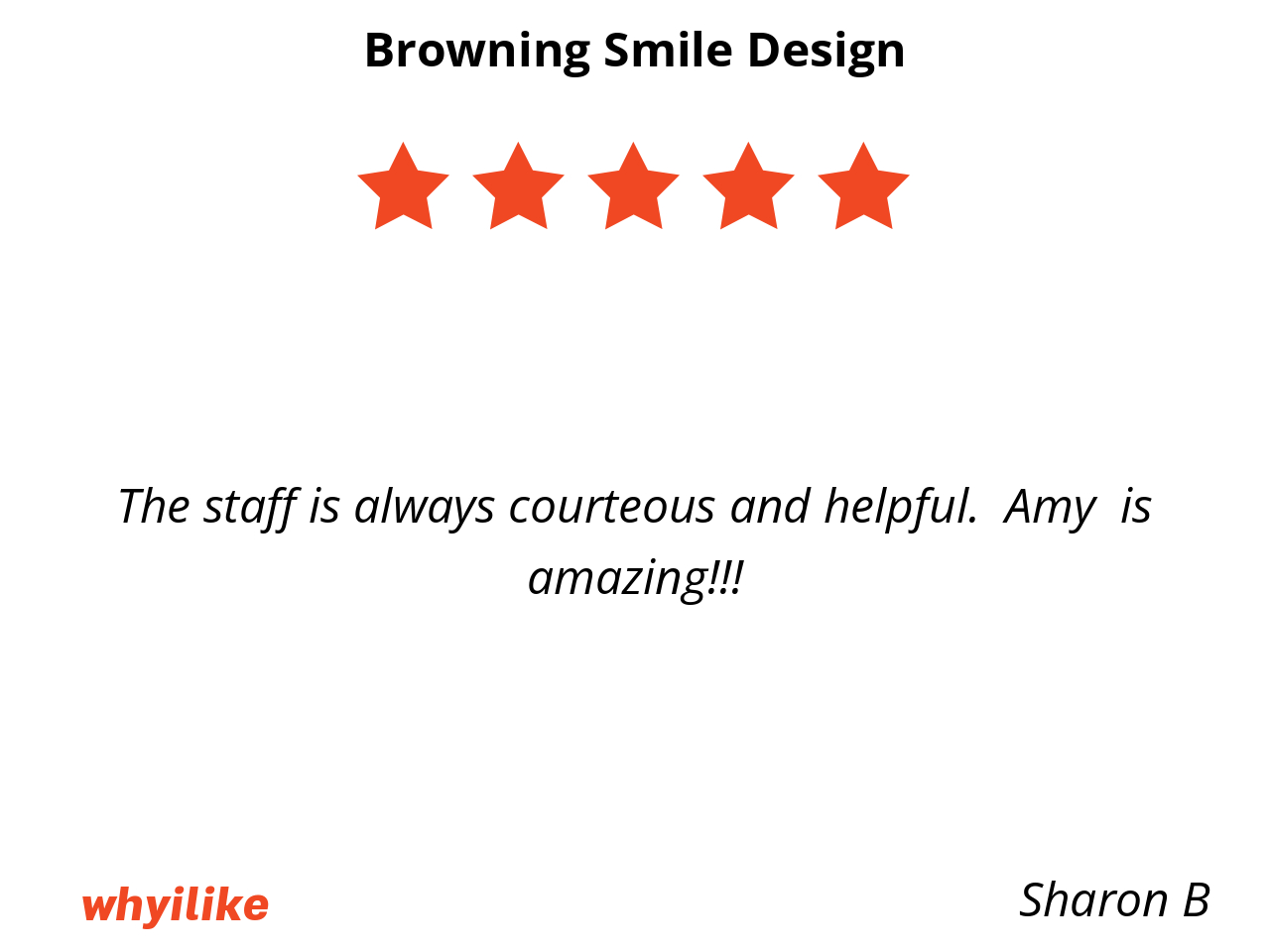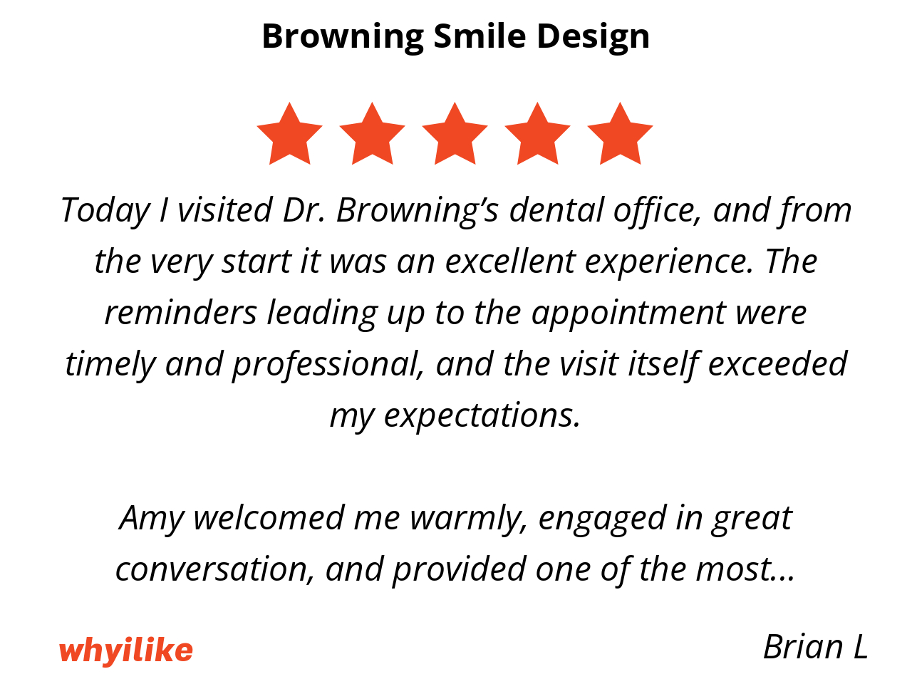 Everyone was so nice and welcoming! Amy is probably the best hygienist I have EVER had! My teeth are so clean now despite my coffee and matcha latte drinking. Dr. Browning is also very nice as well! The previous dentist I went to didn’t even introduce themself before examining my teeth. My experience with Dr. Browning was the complete opposite. He is very knowledgeable, explains things well and is honest. He even has a sense of humor! Can’t wait to continue with my new dentist and hygienist. Also the office is very nice as well! I would highly recommend Browning Smile Design to anyone!
