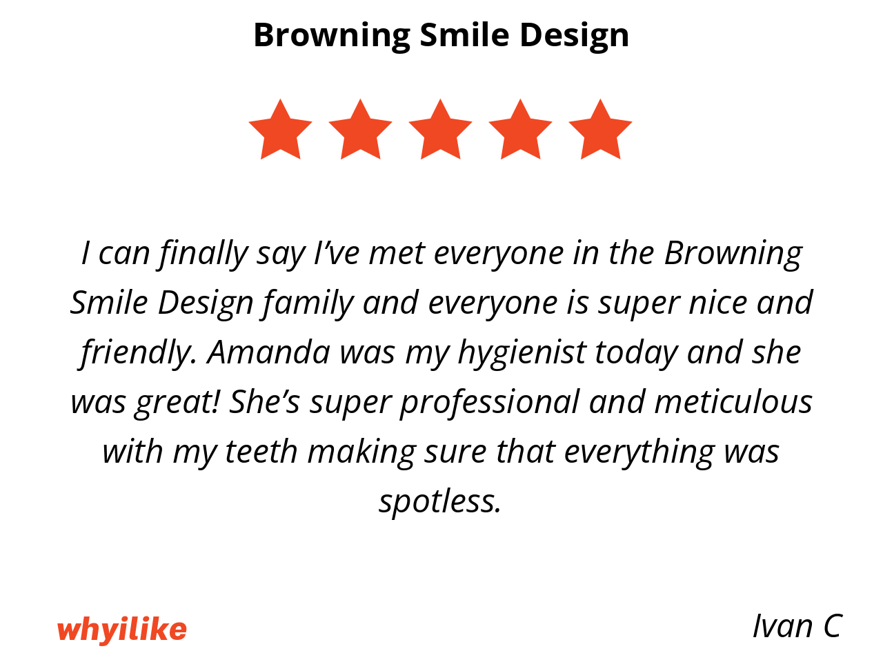 I can finally say I’ve met everyone in the Browning Smile Design family and everyone is super nice and friendly. Amanda was my hygienist today and she was great! She’s super professional and meticulous with my teeth making sure that everything was spotless.