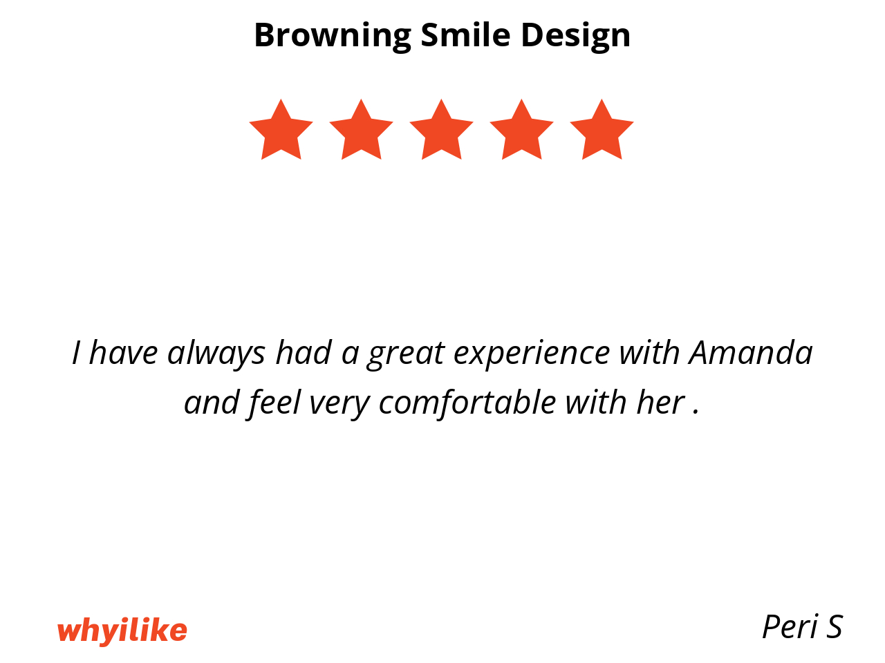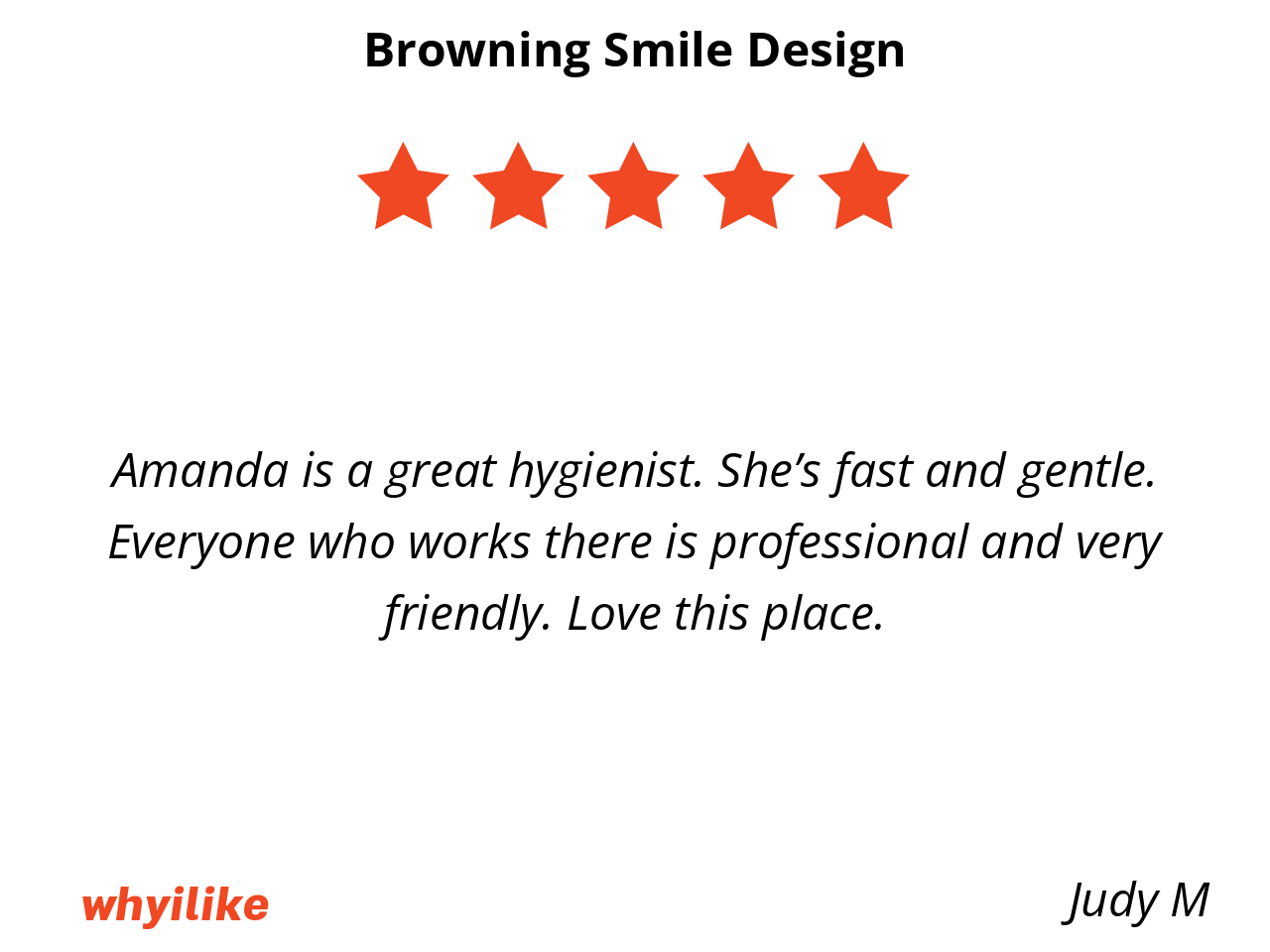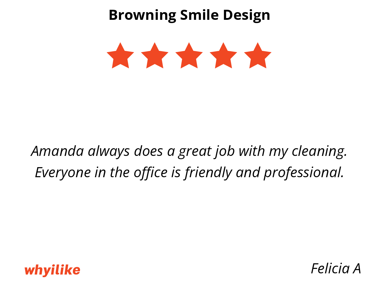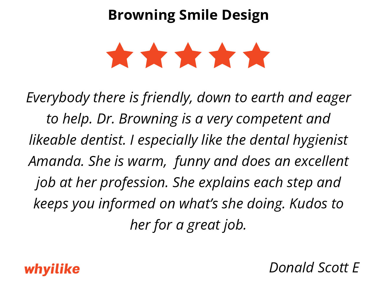 Everybody there is friendly, down to earth and eager to help. Dr. Browning is a very competent and likeable dentist. I especially like the dental hygienist Amanda. She is warm, funny and does an excellent job at her profession. She explains each step and keeps you informed on what’s she doing. Kudos to her for a great job.