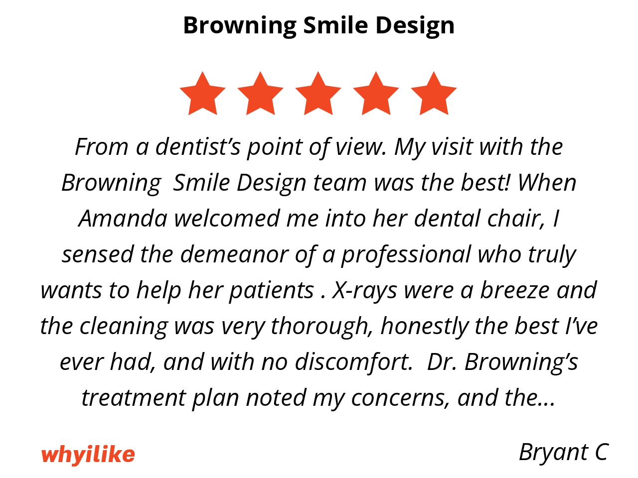 From a dentist’s point of view. My visit with the Browning Smile Design team was the best! When Amanda welcomed me into her dental chair, I sensed the demeanor of a professional who truly wants to help her patients . X-rays were a breeze and the cleaning was very thorough, honestly the best I’ve ever had, and with no discomfort. Dr. Browning’s treatment plan noted my concerns, and the intra-oral photographs revealed some areas I was not aware of that should be addressed. Dr. Browning and his staff have a great chemistry that made my visit a pleasant experience.