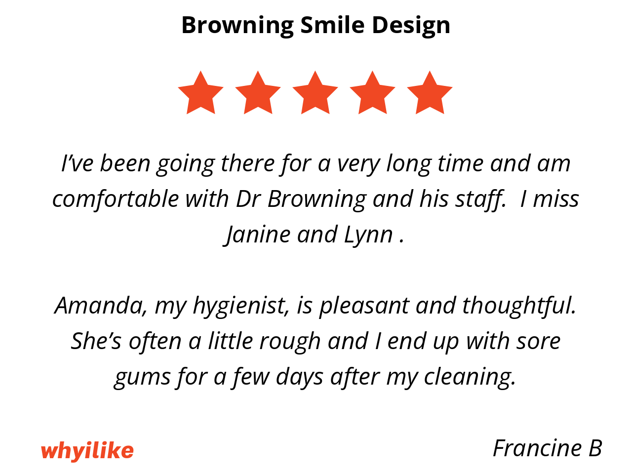 I’ve been going there for a very long time and am comfortable with Dr Browning and his staff. I miss Janine and Lynn .