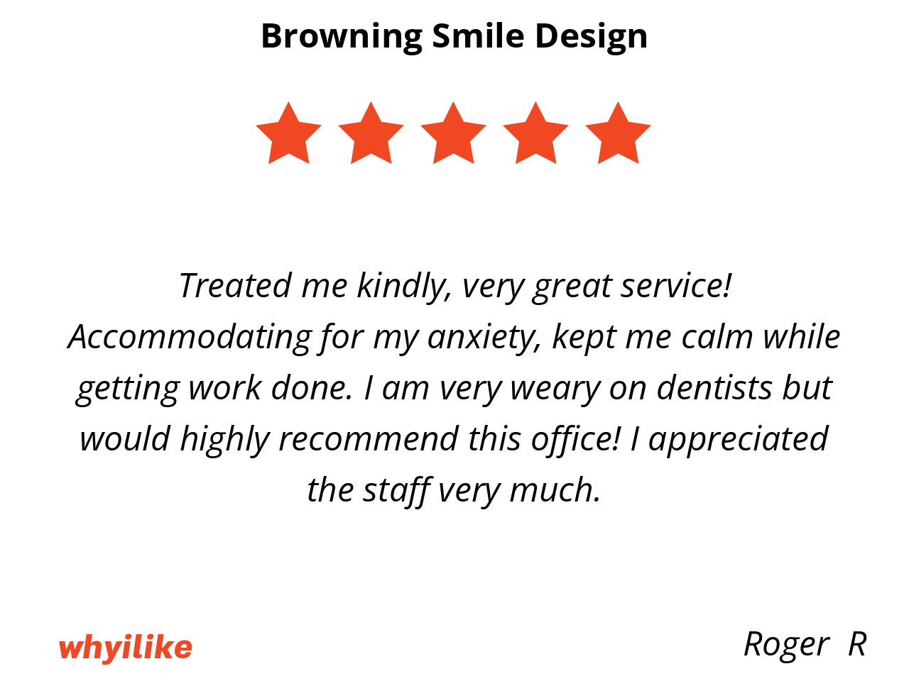Treated me kindly, very great service! Accommodating for my anxiety, kept me calm while getting work done. I am very weary on dentists but would highly recommend this office! I appreciated the staff very much.