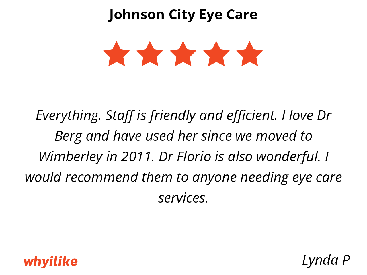 Everything. Staff is friendly and efficient. I love Dr Berg and have used her since we moved to Wimberley in 2011. Dr Florio is also wonderful. I would recommend them to anyone needing eye care services.