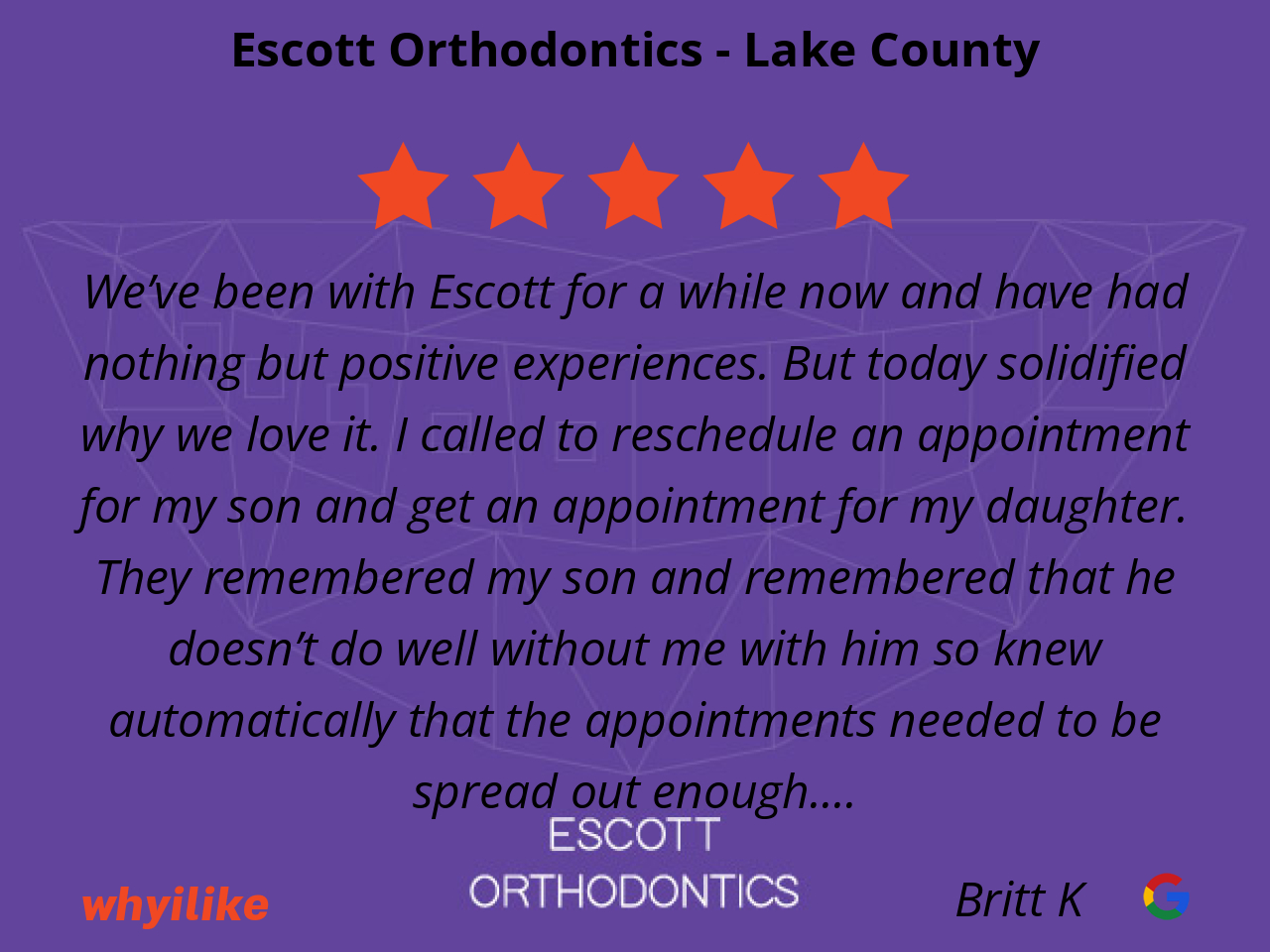 We’ve been with Escott for a while now and have had nothing but positive experiences. But today solidified why we love it. I called to reschedule an appointment for my son and get an appointment for my daughter. They remembered my son and remembered that he doesn’t do well without me with him so knew automatically that the appointments needed to be spread out enough.