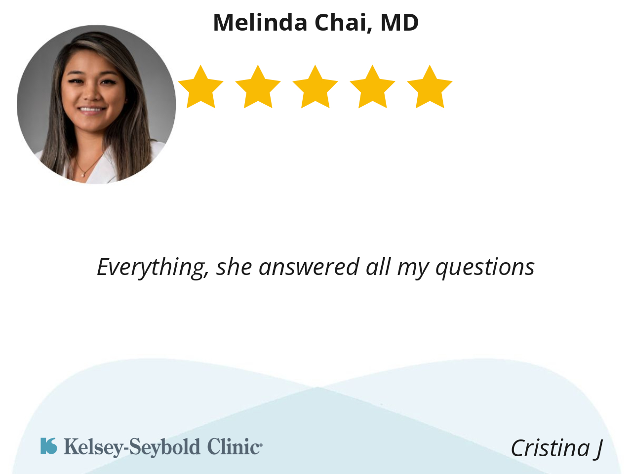 I love Dr. Melinda Chai! She gets straight to the point and provides excellent care. She performed my myomectomy, and everyone is amazed at how well the scar healed—she truly did an outstanding job. She always takes the time to ask if I have any additional questions and makes me feel completely safe and secure.