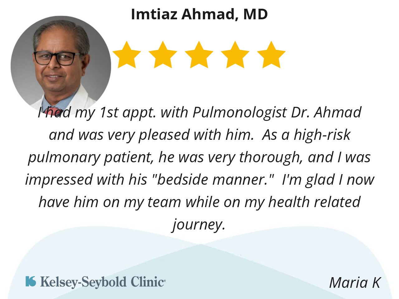 I had my 1st appt. with Pulmonologist Dr. Ahmad and was very pleased with him. As a high-risk pulmonary patient, he was very thorough, and I was impressed with his "bedside manner." I'm glad I now have him on my team while on my health related journey.