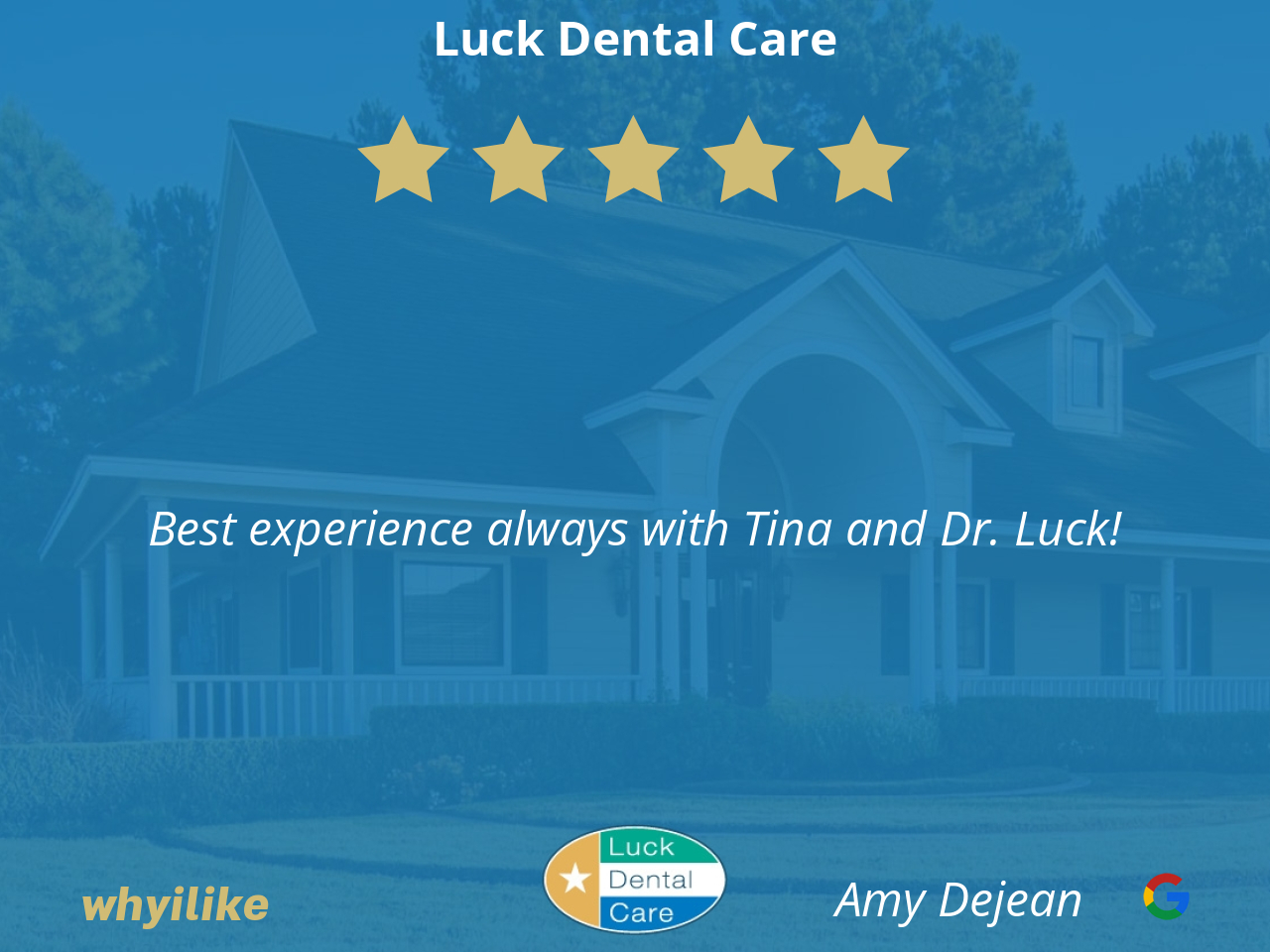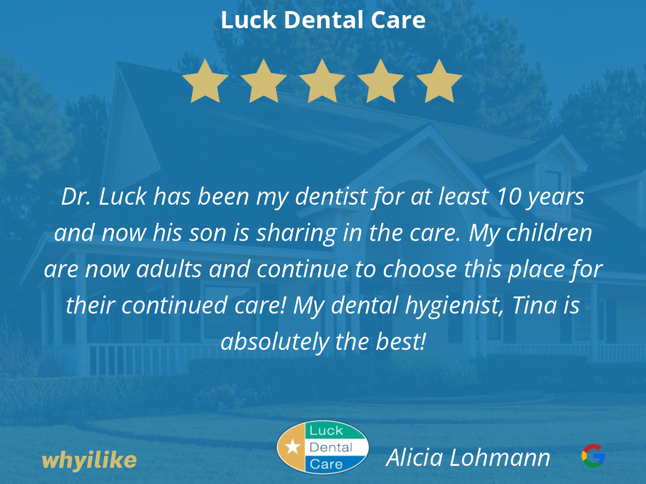 Dr. Luck has been my dentist for at least 10 years and now his son is sharing in the care. My children are now adults and continue to choose this place for their continued care! My dental hygienist, Tina is absolutely the best!