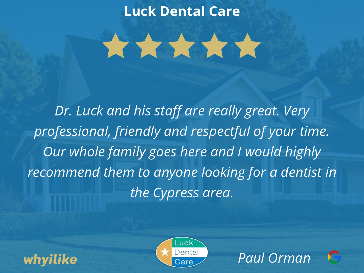 Dr. Luck and his staff are really great. Very professional, friendly and respectful of your time. Our whole family goes here and I would highly recommend them to anyone looking for a dentist in the Cypress area.